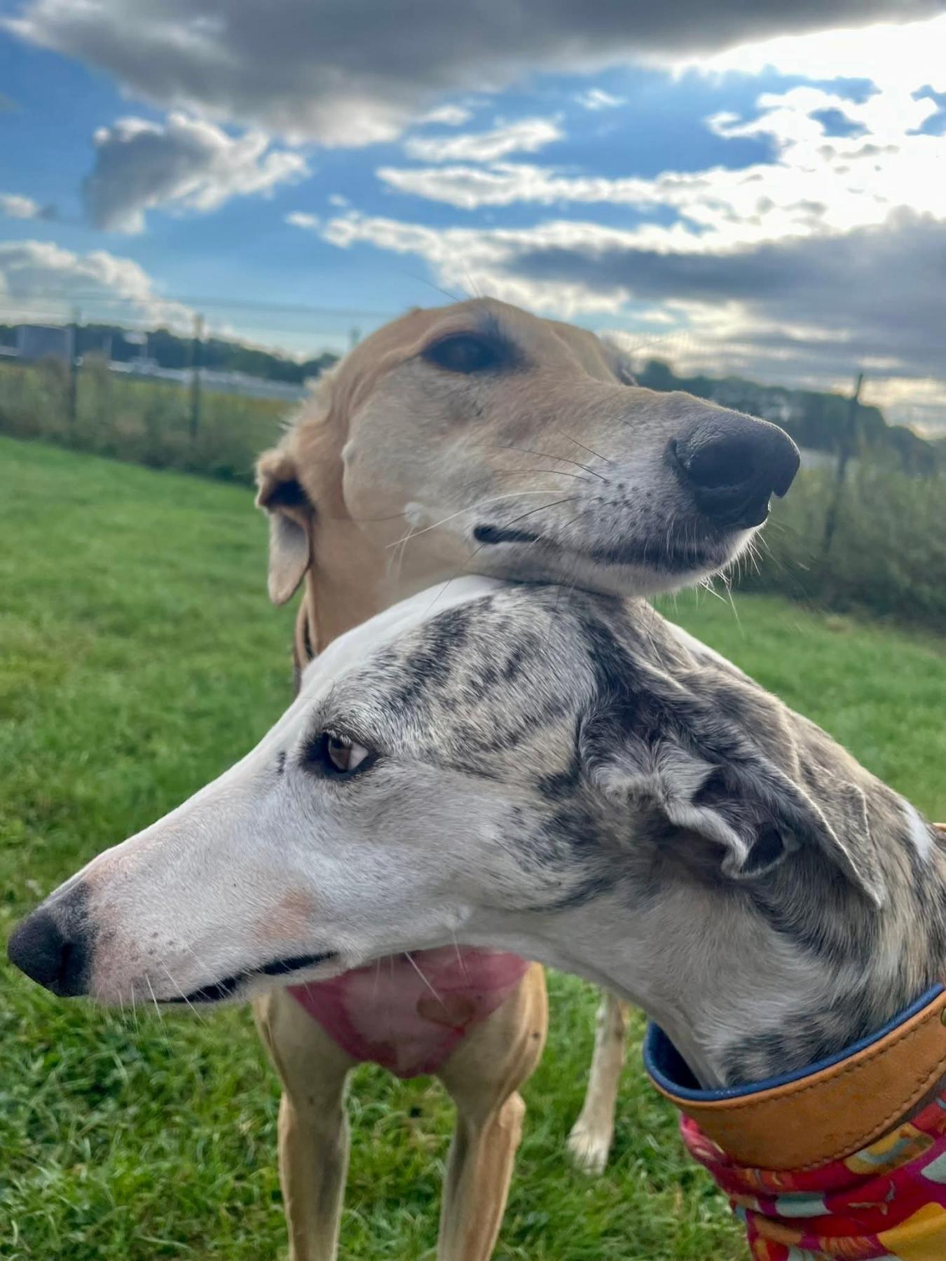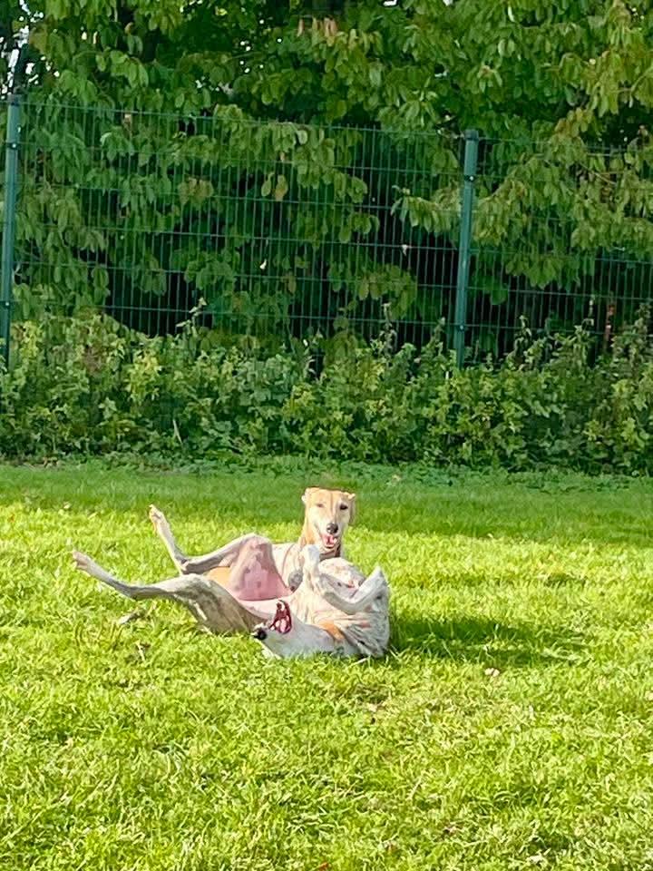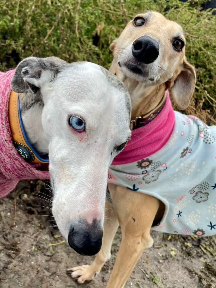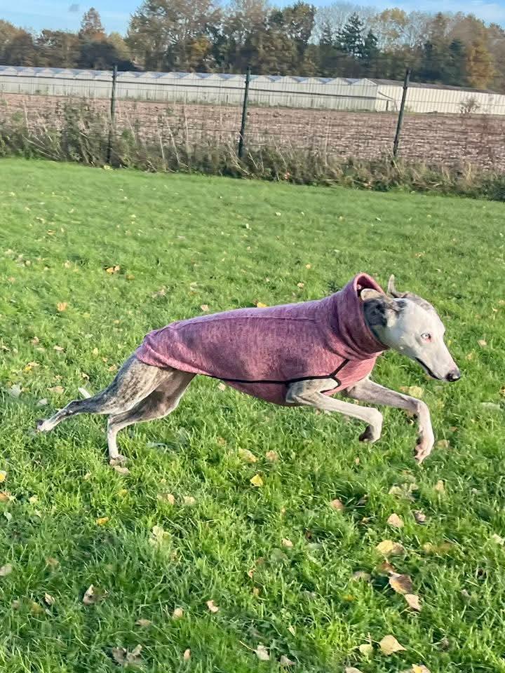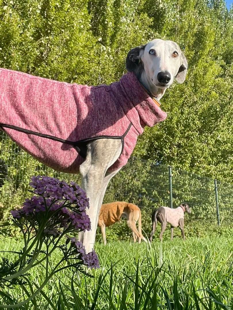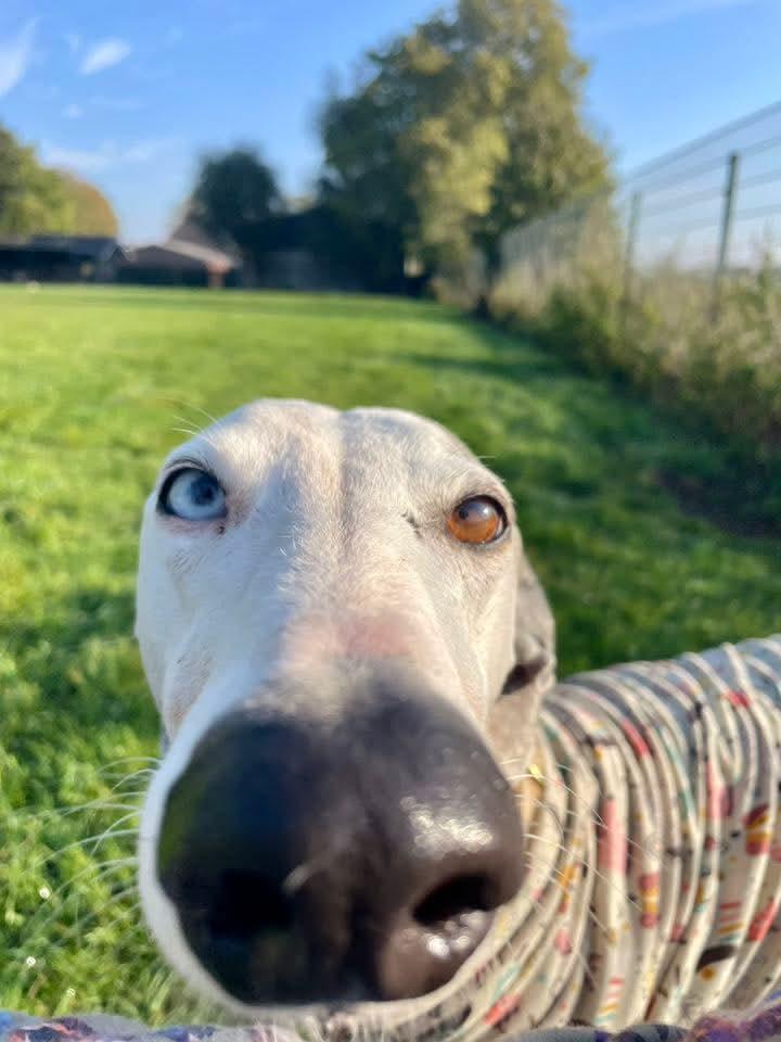 Almi heeft een blauw en een bruin oog, wat haar een bijzondere uitstraling geeft. Ze is een pracht van een hond. Almi kwam in ons asiel terecht met al haar pups. De pups zijn allemaal geadopteerd en nu is het hopelijk de beurt aan de mama.Almi is een zeer vriendelijke aanhankelijke Galgo. Ze is altijd vrolijk en komt knuffels bij je halen.Ze is heel speels met de andere honden.