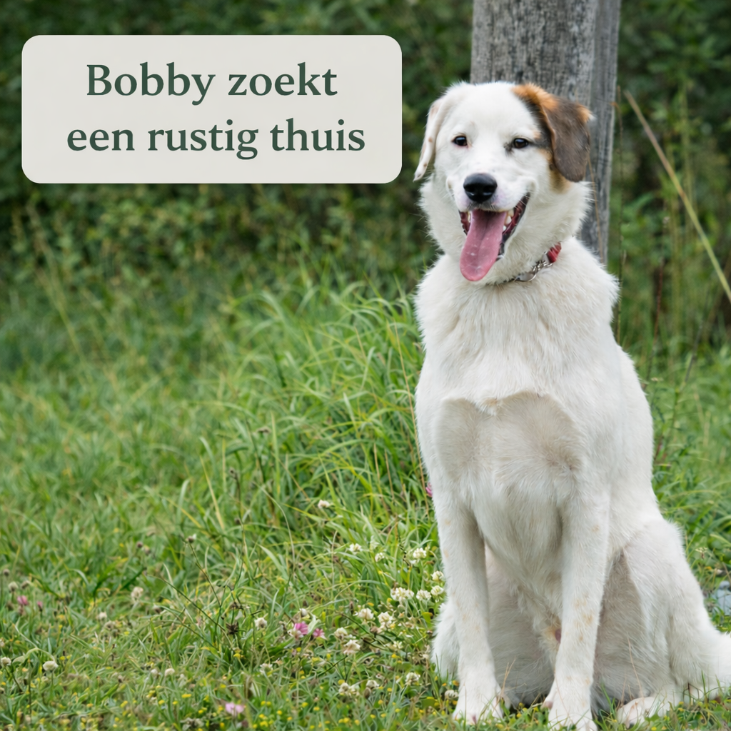 Bobby is een rustige reu van bijna 4 jaar die een prikkelarm en ervaren thuis zoekt zonder kinderen, bij 1–2 volwassenen. Buiten is hij sociaal, loopt netjes mee en wandelt graag; binnen heeft hij behoefte aan rust, duidelijkheid en voorspelbaarheid. Hij is bench-gewend, gecastreerd en krijgt maandelijkse medicatie voor zijn heupen. Voor Bobby zoeken we een match bij iemand met hondenervarin