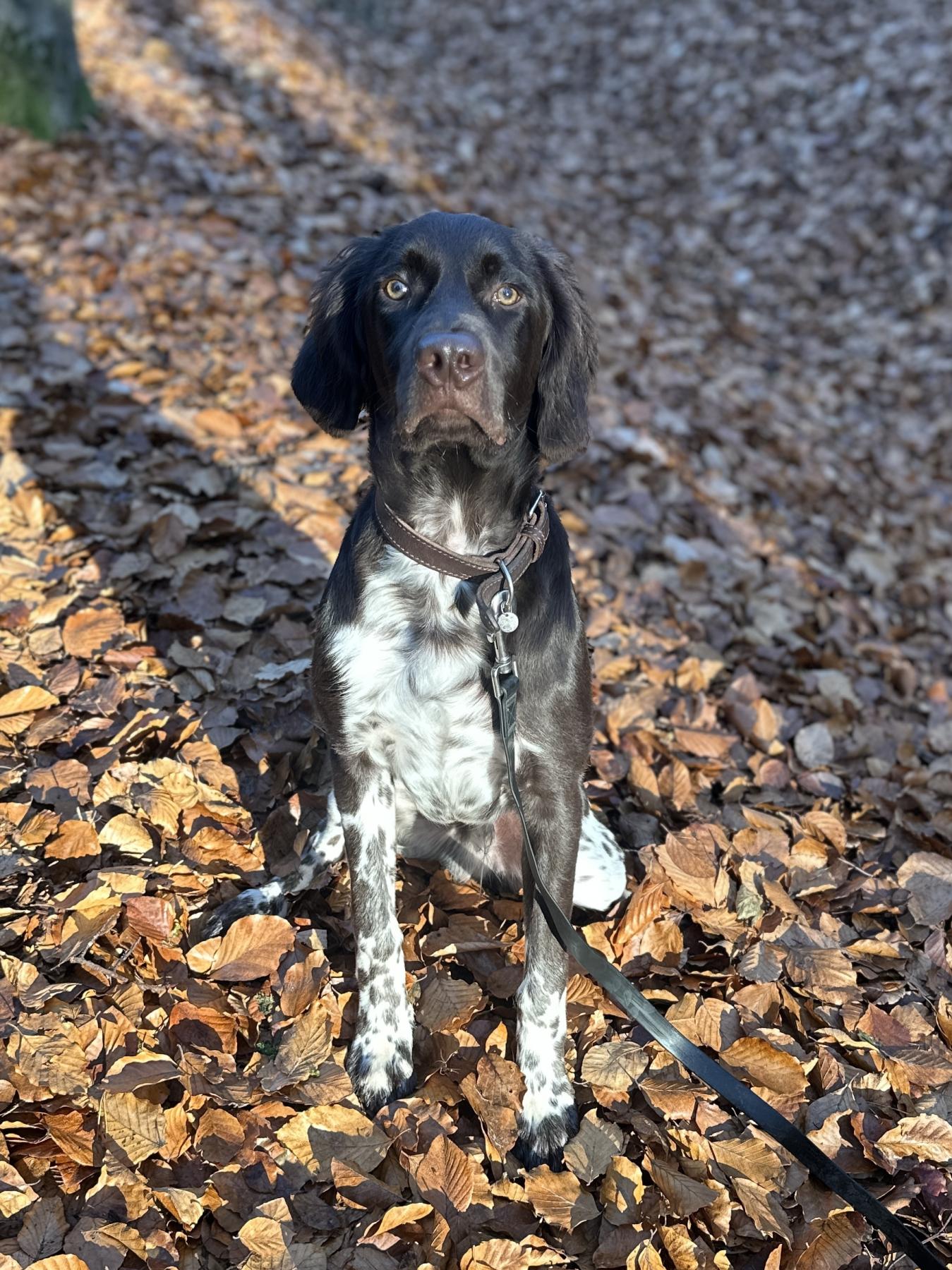 Buiten is hij nog snel afgeleid en heeft dan minder aandacht voor de baas. Hij kan nog niet los lopen. Wel met apporteren los en andere spelletjes aan lange lijn. Speuren is hij erg goed in.