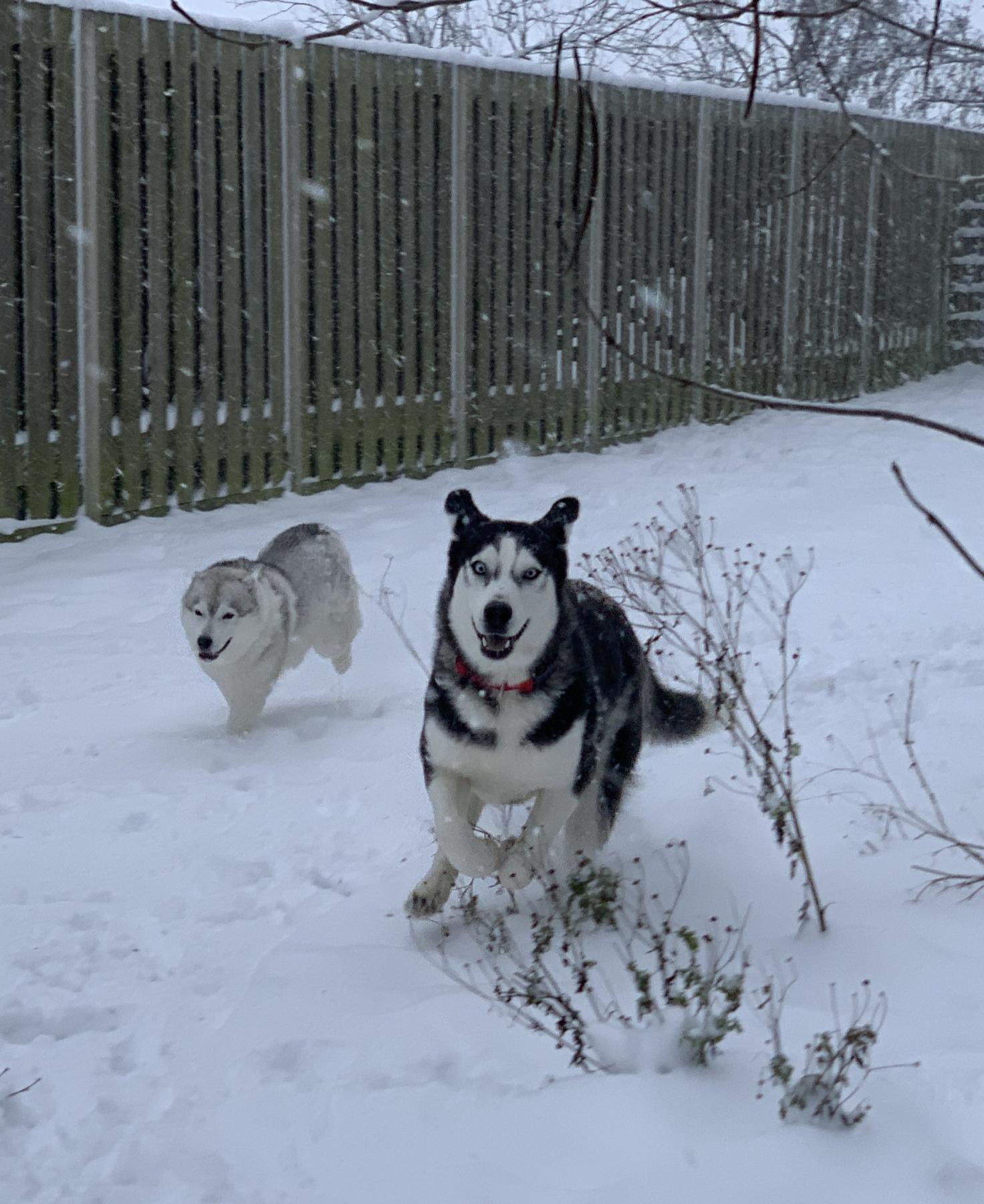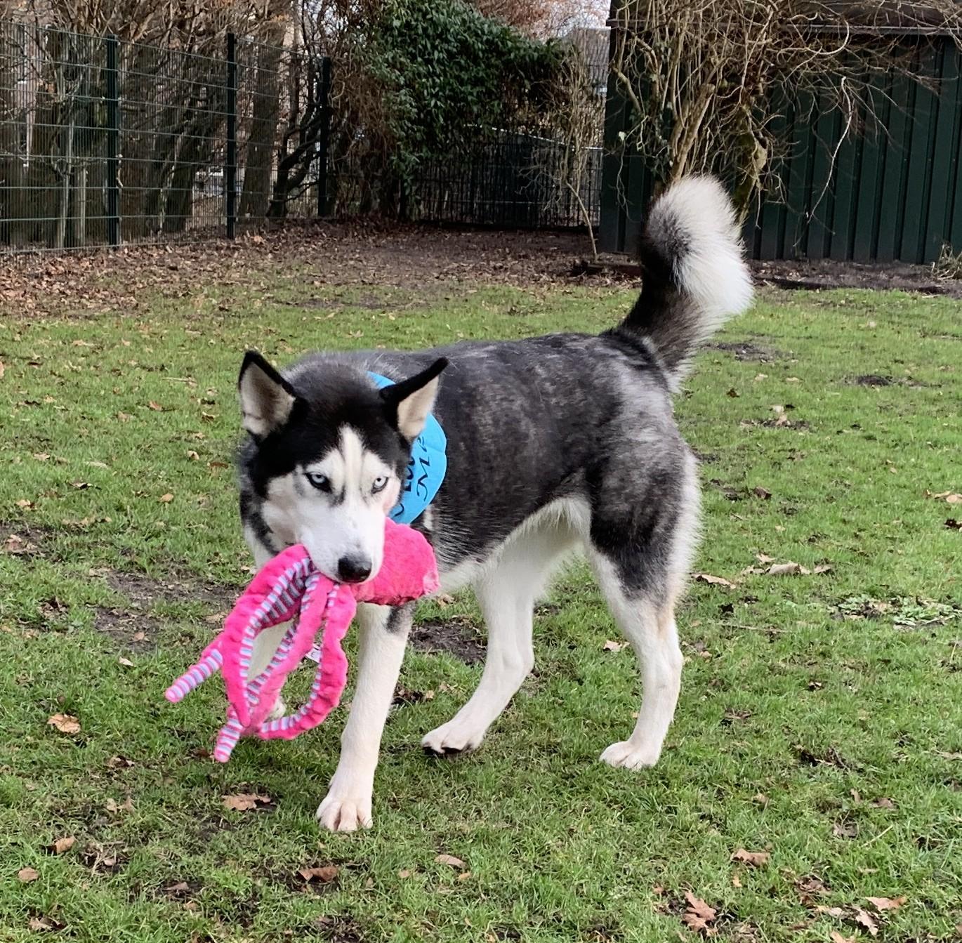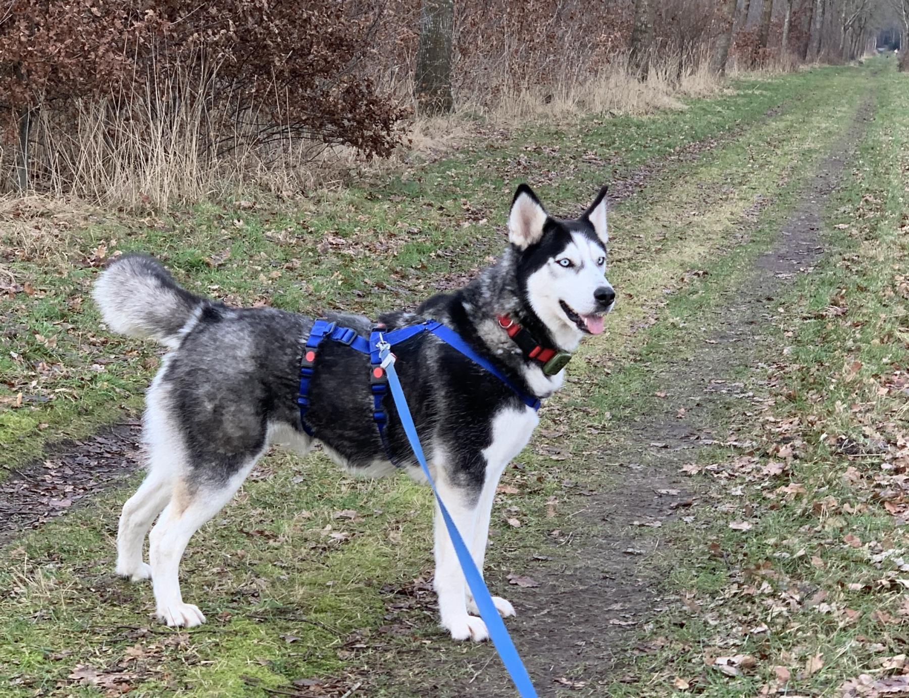 Dama is een prachtige huskydame die met 58cm behoorlijk aan de maat is. Ze is 2 jaar oud (april 23) en heeft een typische husky uitstraling met haar ijsblauwe ogen. Ook haar karakter is typisch husky, met prettige kanten zoals vriendelijk, sociaal en speels, maar zeker ook de uitdagende kanten zoals slopen, graven, eigenwijs, slecht alleen kunnen zijn en trekken aan de lijn. Ze kan in de roedel wat dominant overkomen en we zien haar het liefst bij een reu geplaatst of als hond alleen. Ze mag graag spelen met andere honden maar is voor kleiner formaat honden wat te. Kan zich ook prima met speeltjes vermaken. Ze wil niet opgesloten zitten in een bench maar los in huis is het nog opletten want ze moet nog alles leren als huishond. Ze loopt wel makkelijk mee aan de lijn. Aanhankelijk en open.
