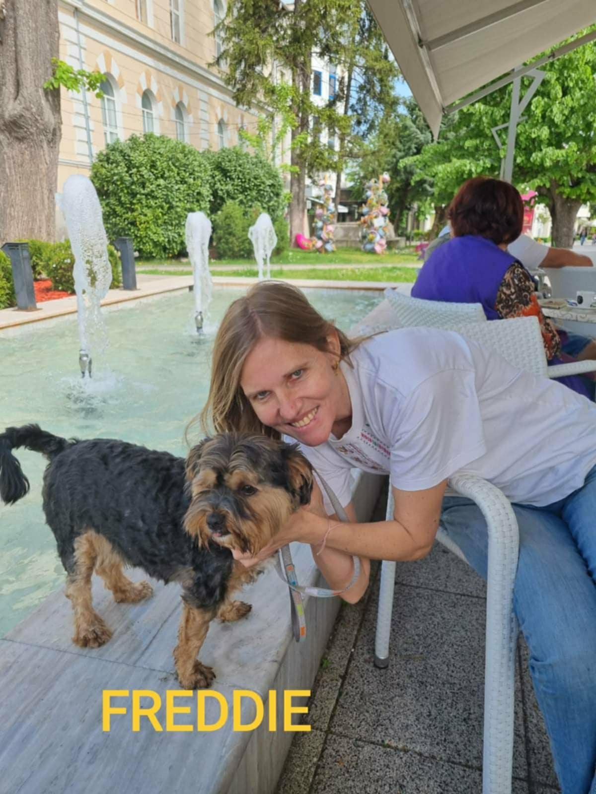 Freddie is een klein hondje van ongeveer 7 kilo.