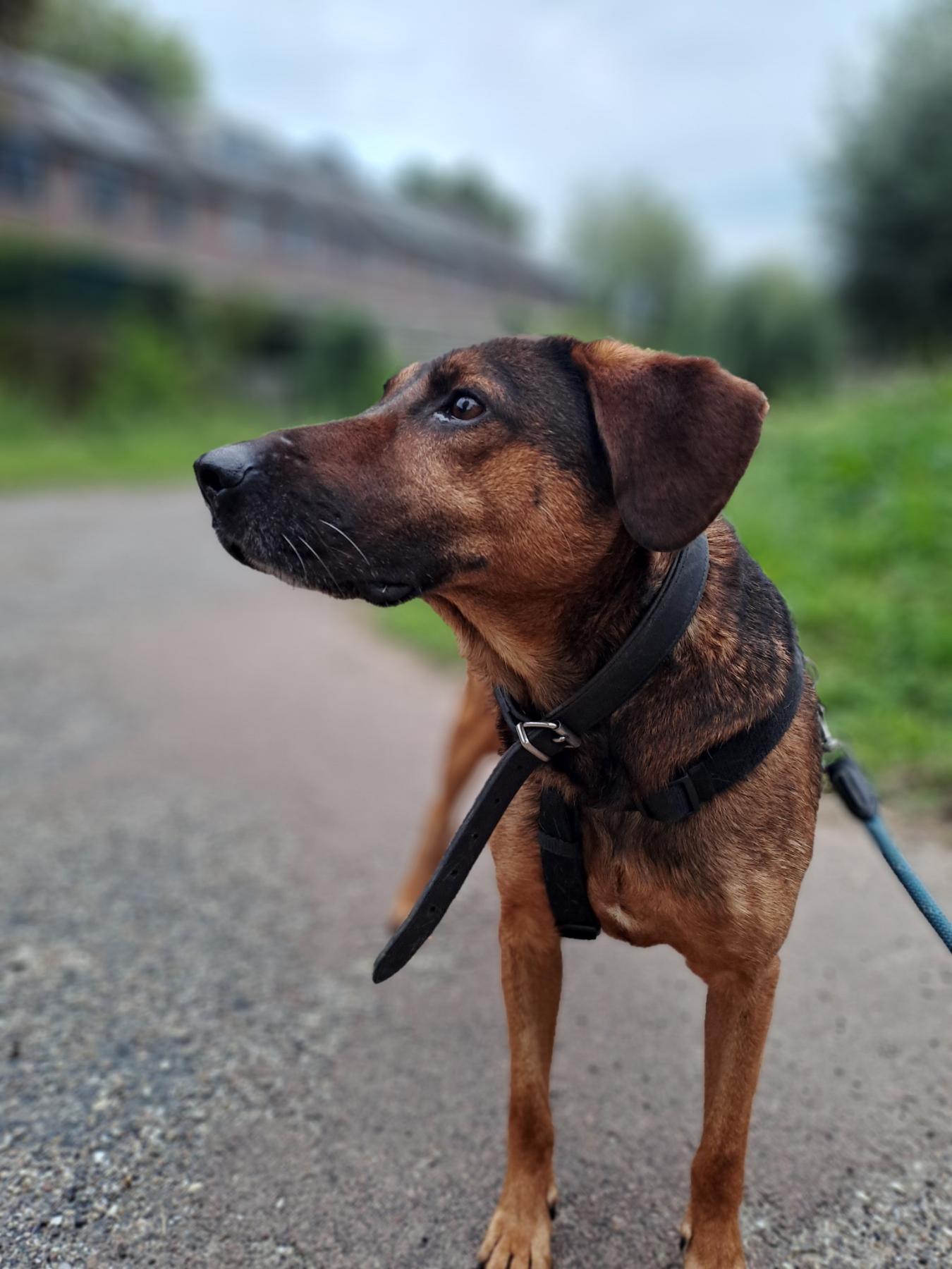 Bulgaarse voormalig kettinghond. Heeft 7 jaar (zijn hele leven) aan een korte ketting in de blubber gestaan. Hij doet het geweldig goed als huishond. Is zeer rustig, stil en prettig in huis. n