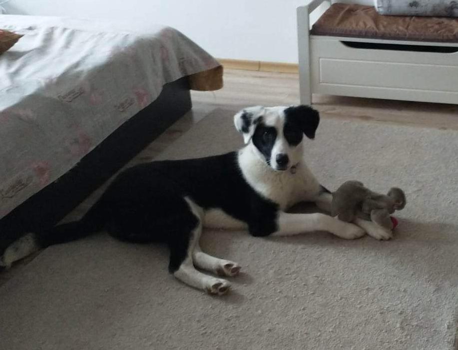 Karoline is gevonden in een zak. Ze zat daarin vastgebonden om ervoor te zorgen dat ze niet weg kon komen. De zak waarin ze gevonden is, staat ook tussen haar foto's op onze website. De man die haar meenam had een vreemd idee over het omgaan met rescuehonden. Hij nam haar mee naar een plaats waar auto's werden gerepareerd. Een plaats zonder buitenruimte en zonder ramen. Ze heeft daar zes maanden zonder licht en verse lucht gewoond. Geen wandelingen, geen aandacht. Ze kreeg eens in de een of twee dagen water en eten en dan werd haar poep ook opgeruimd. Meer aandacht was er niet. Op dat moment was Karolina wanhopig en doodsbang. Altijd als de man was gekomen was ze weggekropen. Ze was nog nooit aangeraakt. Toen onze rescuer dat hoorde, én de mogelijkheid had van een gastgezin is ze erheen gegaan en heeft Karoline weggehaald. De achterbenen waren heel slap. Ze was gevoerd met het goedkoopste voer dat je kon krijgen. Geen calcium en andere belangrijke voedingsstoffen. Ze kon haar achterkant niet meer goed gebruiken. De dierenarts gaf haar injecties en medicatie om haar een booster te geven. Ze kreeg vitamines en calcium extra toegediend. Haar lijf werd gerepareerd. Haar ziel is nog steeds diep beschadigd.