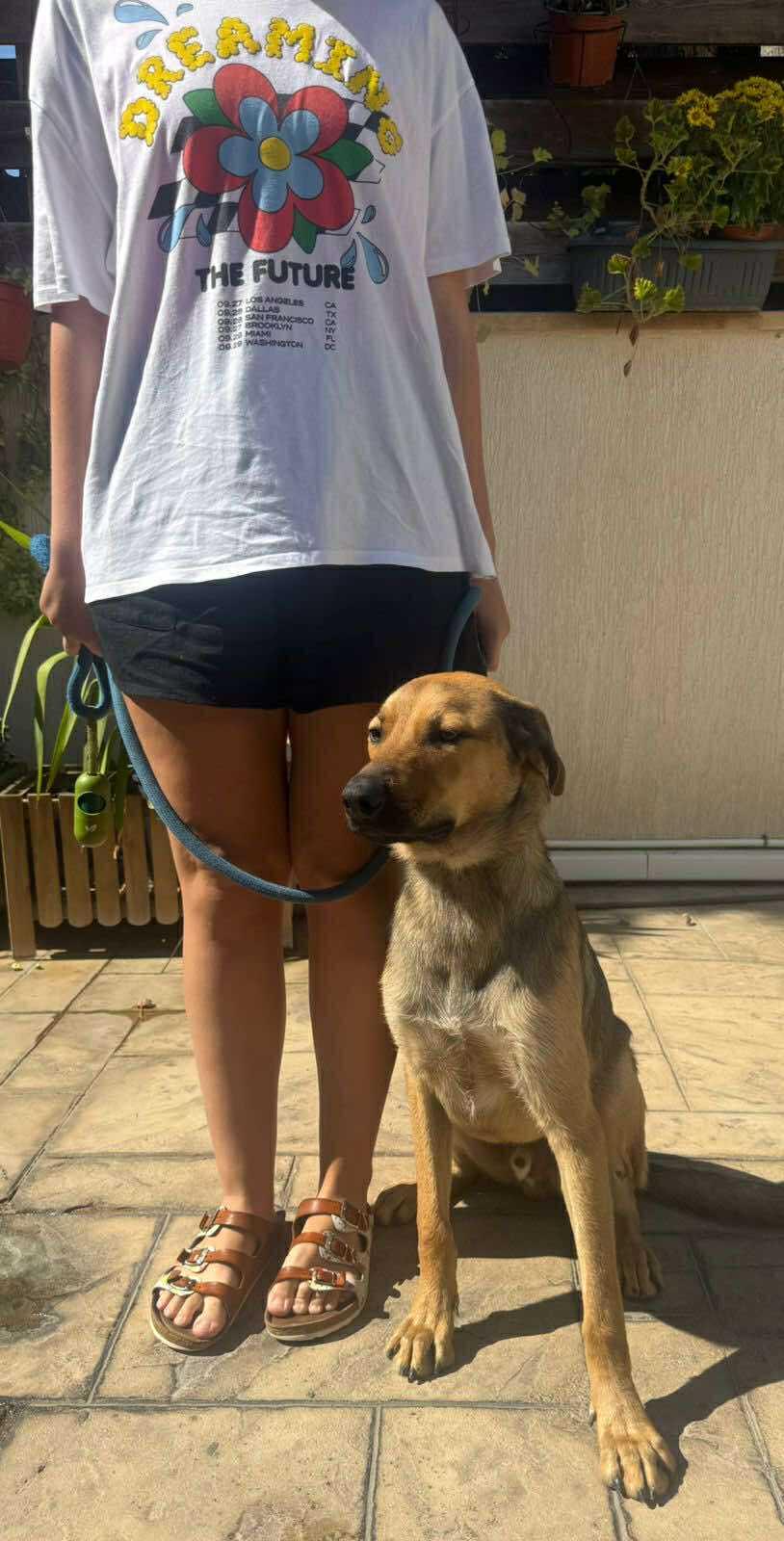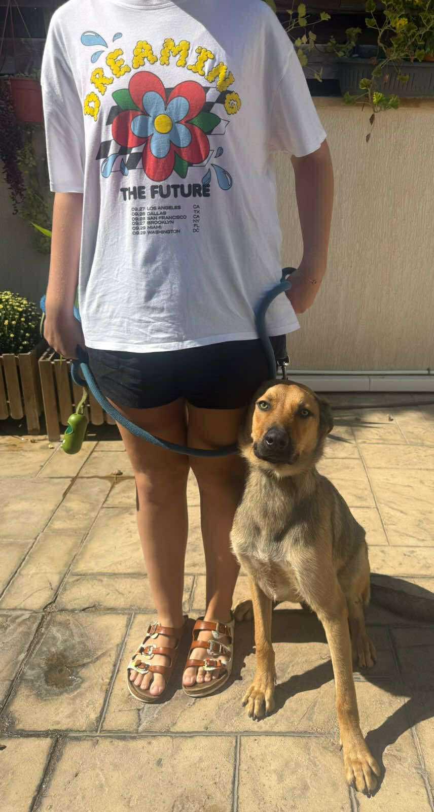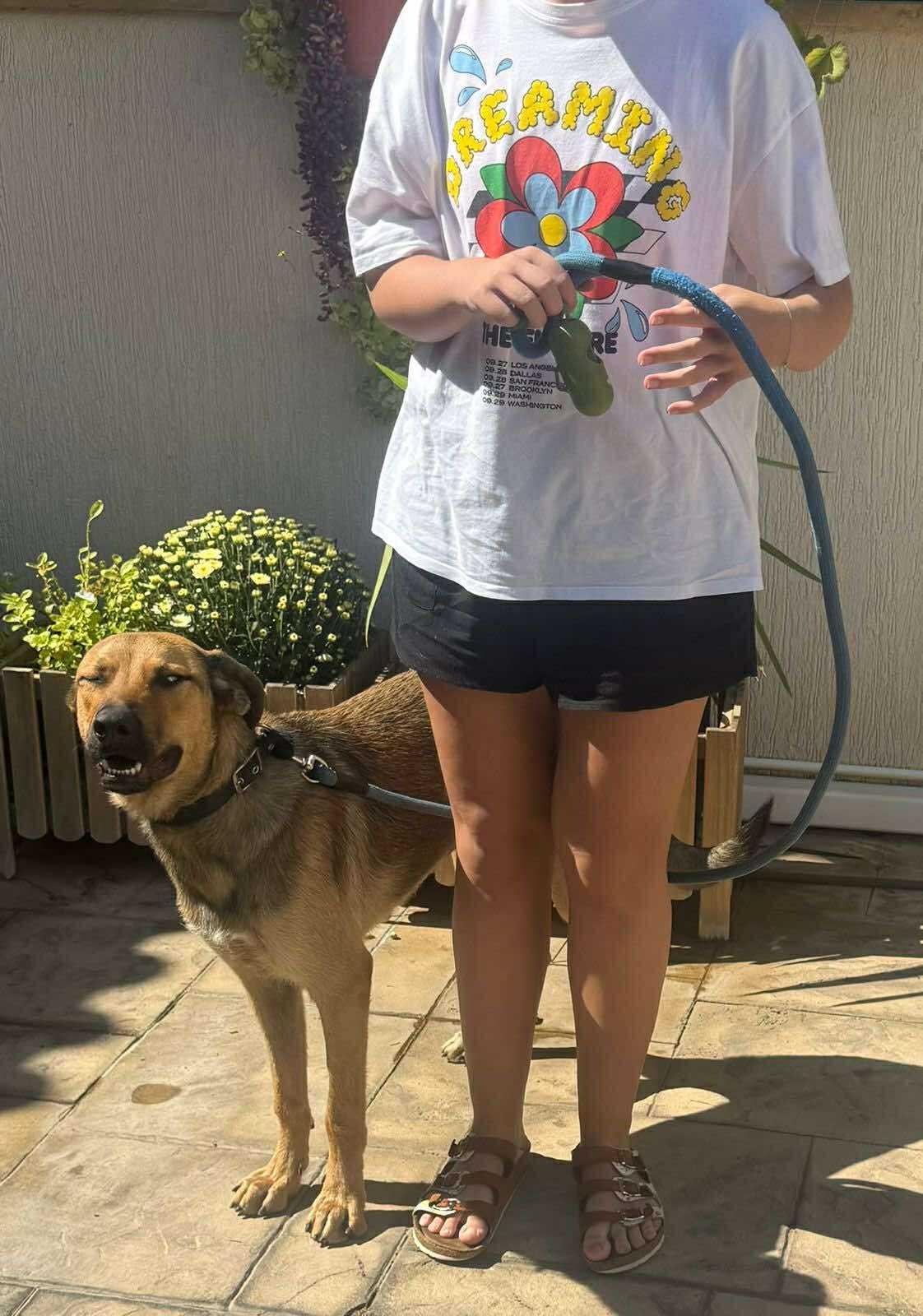 Hij kan aan de riem wandelen (al trekt hij soms wat) en kent de basiscommando’s zit, lig en kom hier.