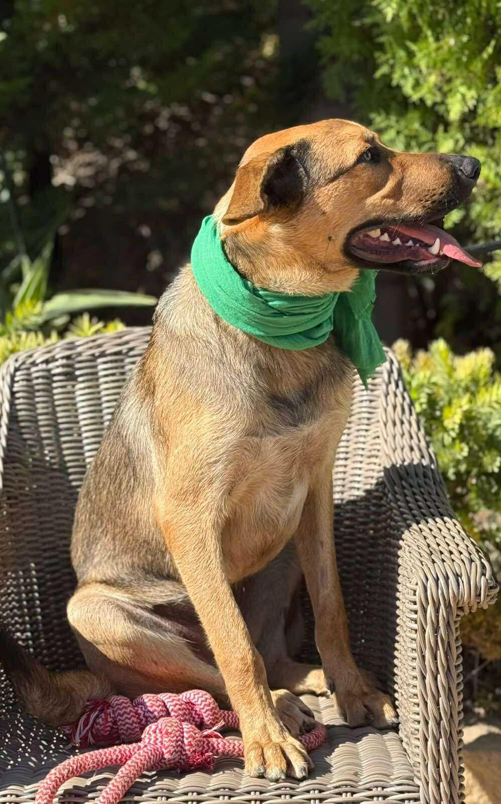 Een grote, jonge hond van ongeveer 28 kg en 73 cm hoog, sterk, gezond en vol leven.