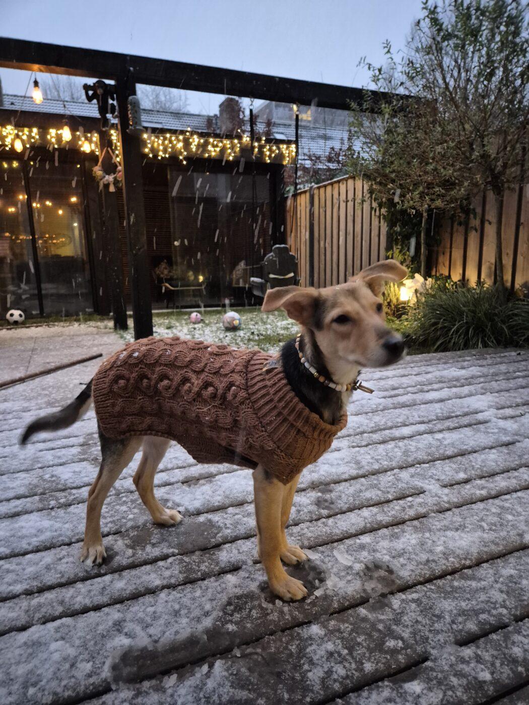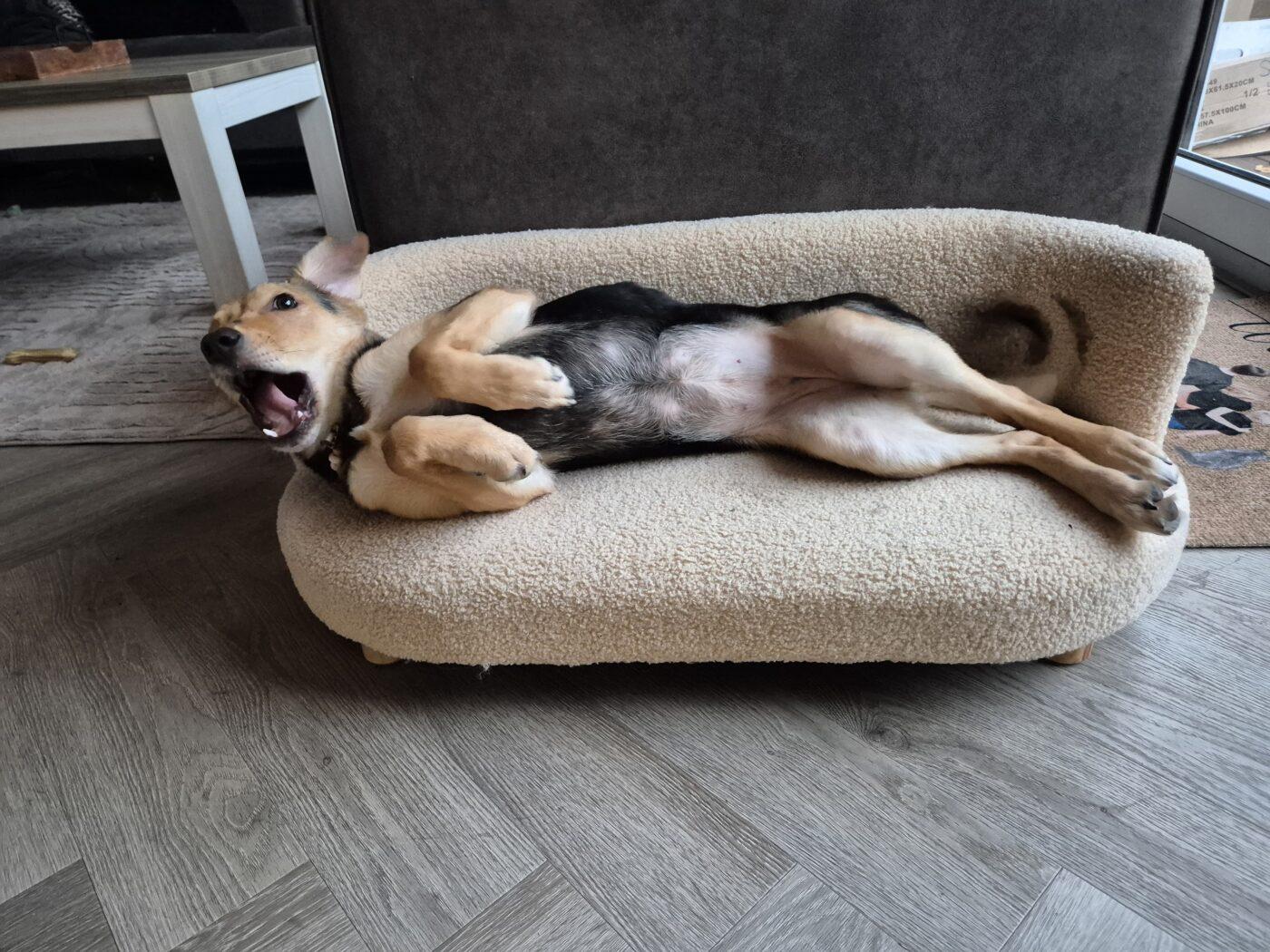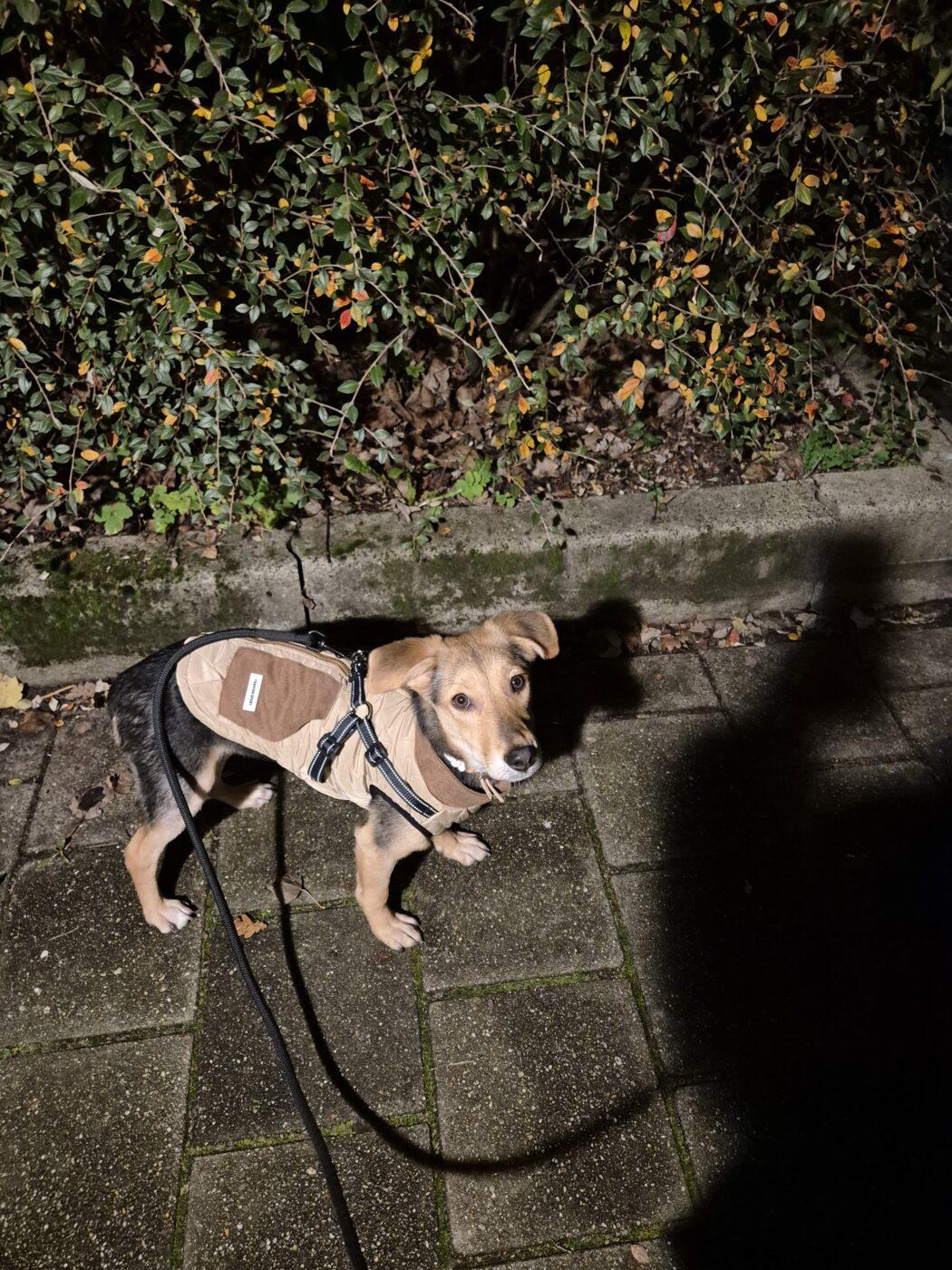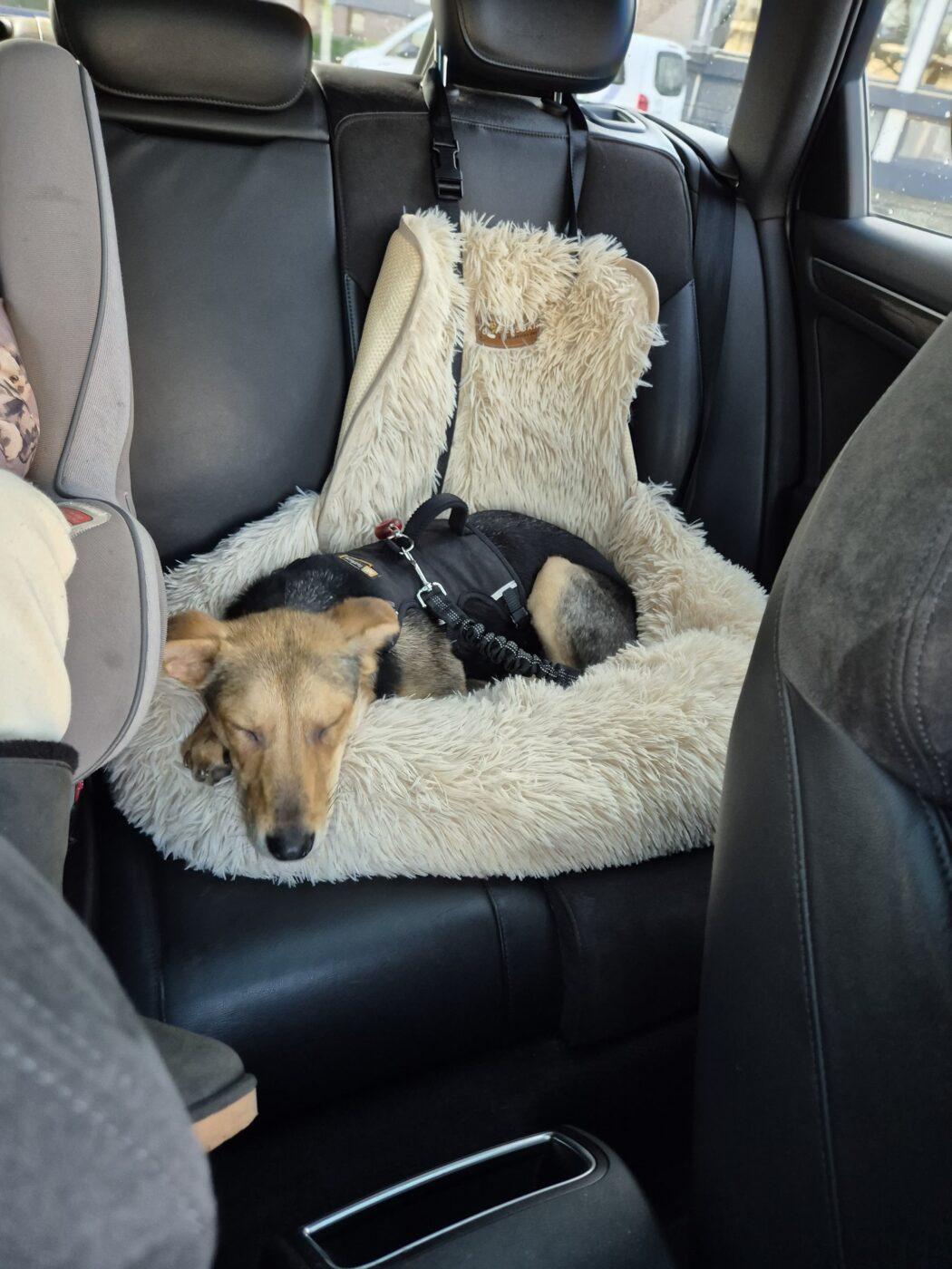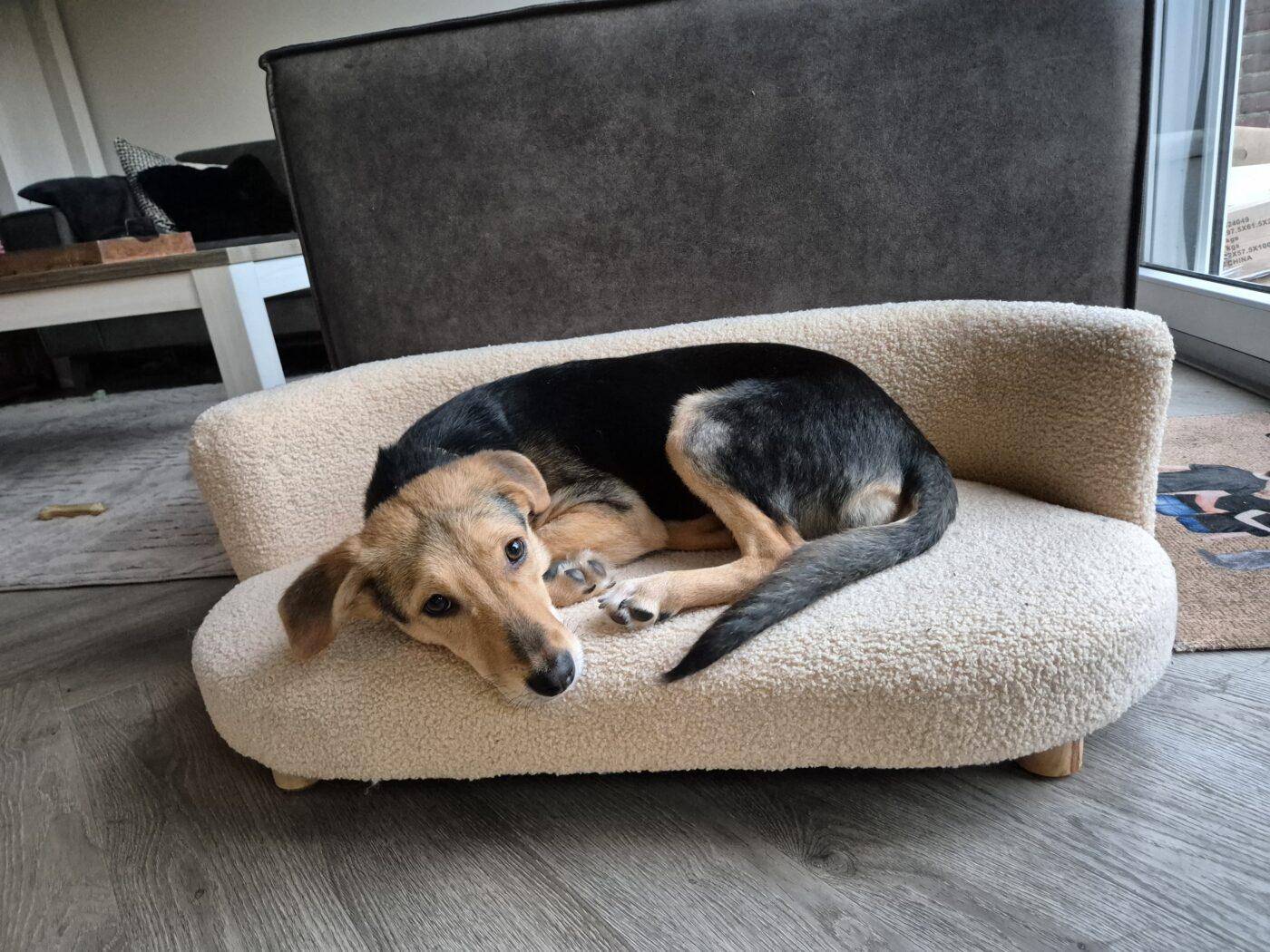 In huis is Lola al verrassend stabiel. Ze is volledig zindelijk, slaapt ’s nachts rustig in haar bench en kan overdag los in huis blijven, ook wanneer haar mensen even weg zijn. Een paar uur alleen thuis blijven gaat goed. Autorijden doet ze ontspannen; ze gaat rustig liggen en reist makkelijk mee.
