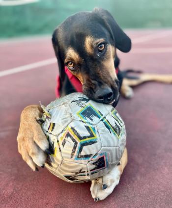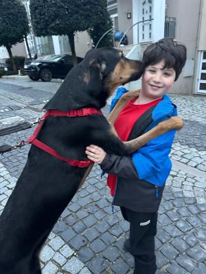 Nora is erg goed met kinderen. Maar omdat ze een grote hond is en nog erg jong en zo enthousiast wordt als ze mensen ziet, is het beter dat ze niet bij hele jonge kinderen wordt geplaatst. Want ze zou kunnen springen om geaaid te willen worden.