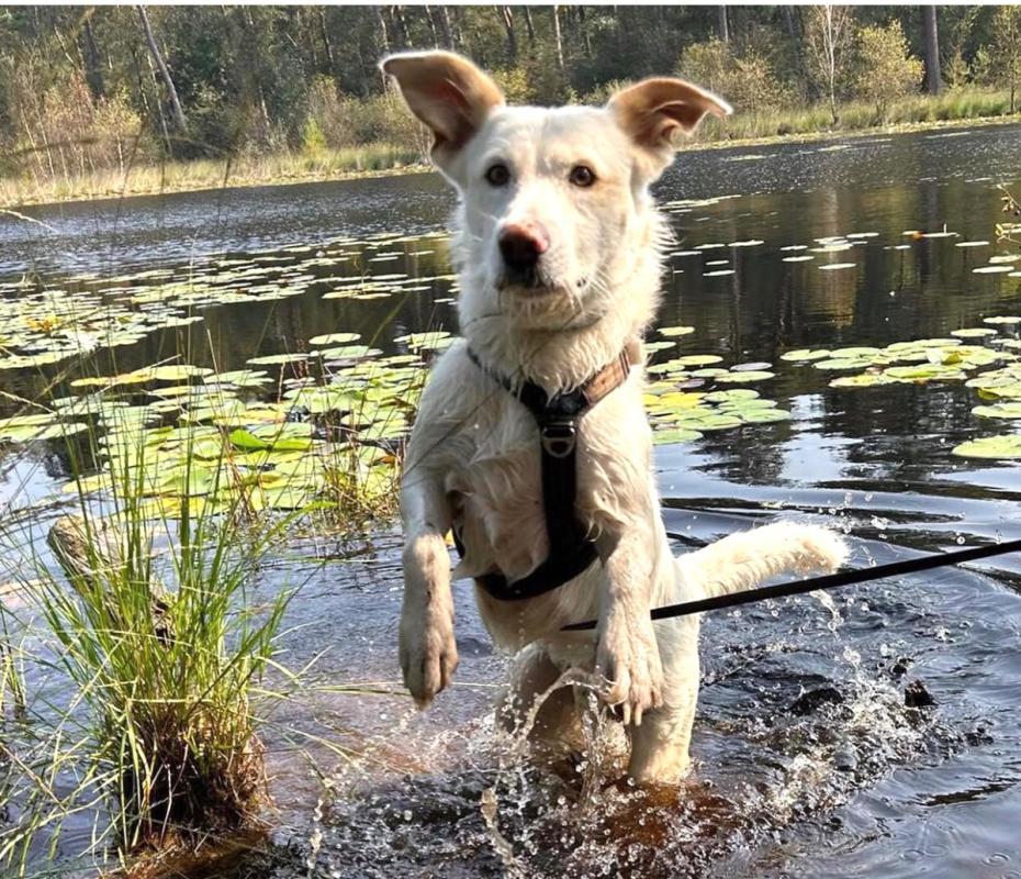 Sam is een vrolijke, aanhankelijke hond, maar wel onzeker.