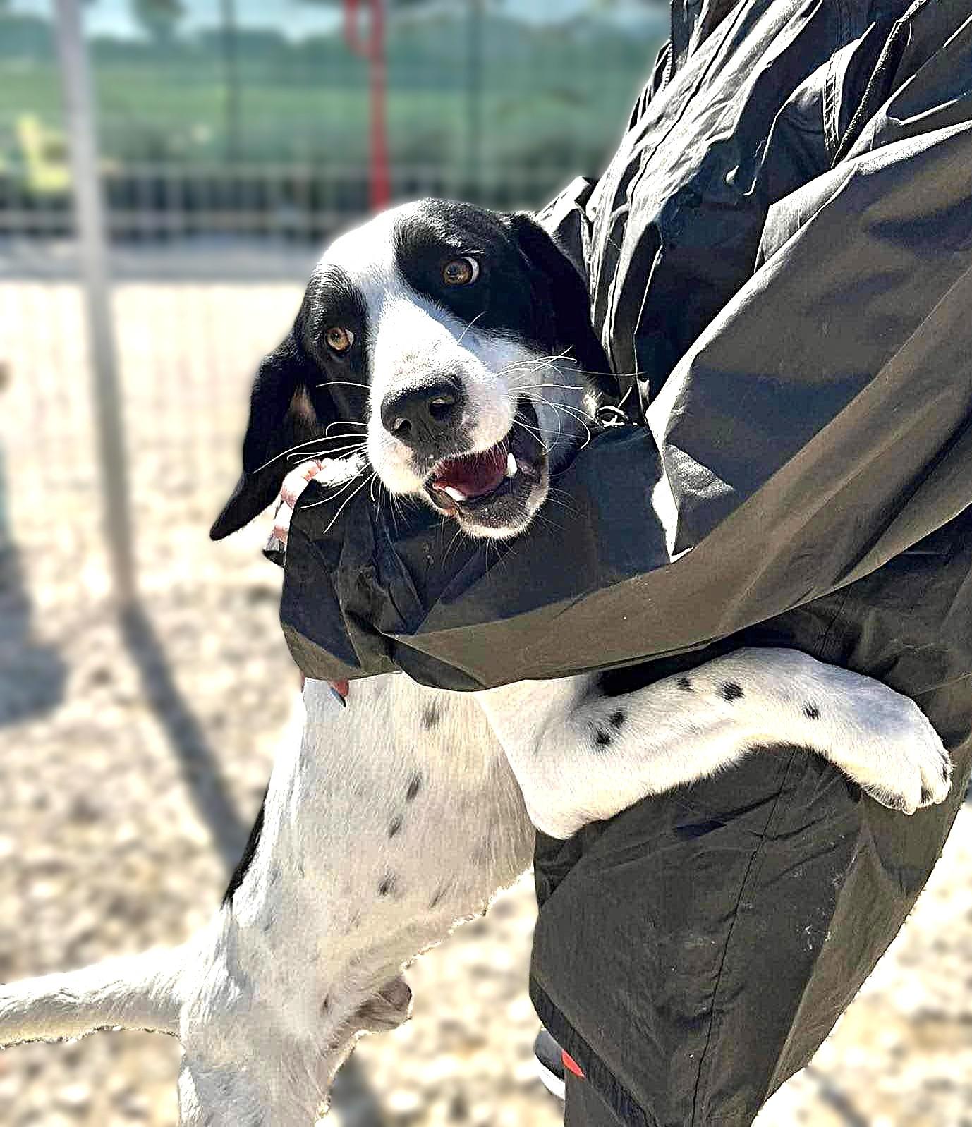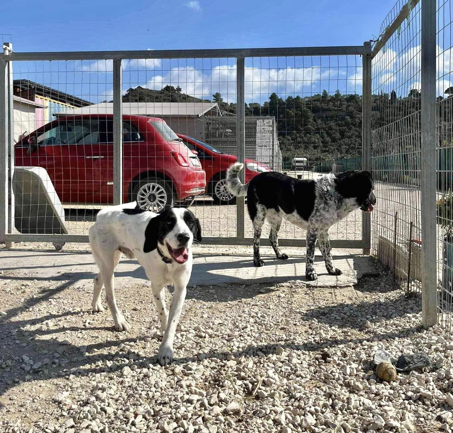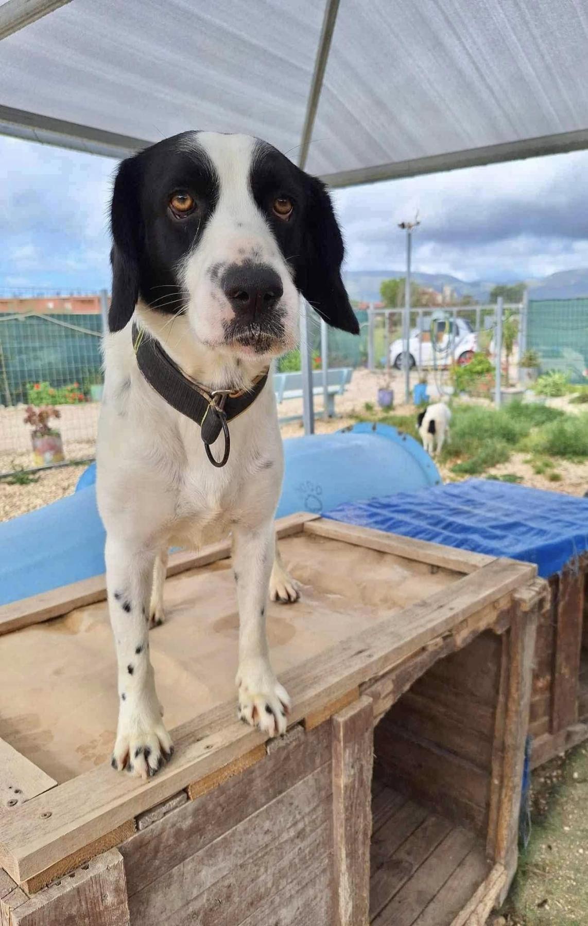 Spotty heeft zijn naam te danken aan de verschillende plekken (spots) waar hij werd gesignaleerd en aan de zwarte vlekken op zijn vacht. Spotty is een gezellige knuffelaar en gek op zijn verzorgers. (zie de filmpjes). Sporty is een sportieve, jonge hond.Hij gaat goed om met de andere honden in de shelter. Met katten is hij echter helemaal niet goed, dus een gezin met katten is geen goed idee