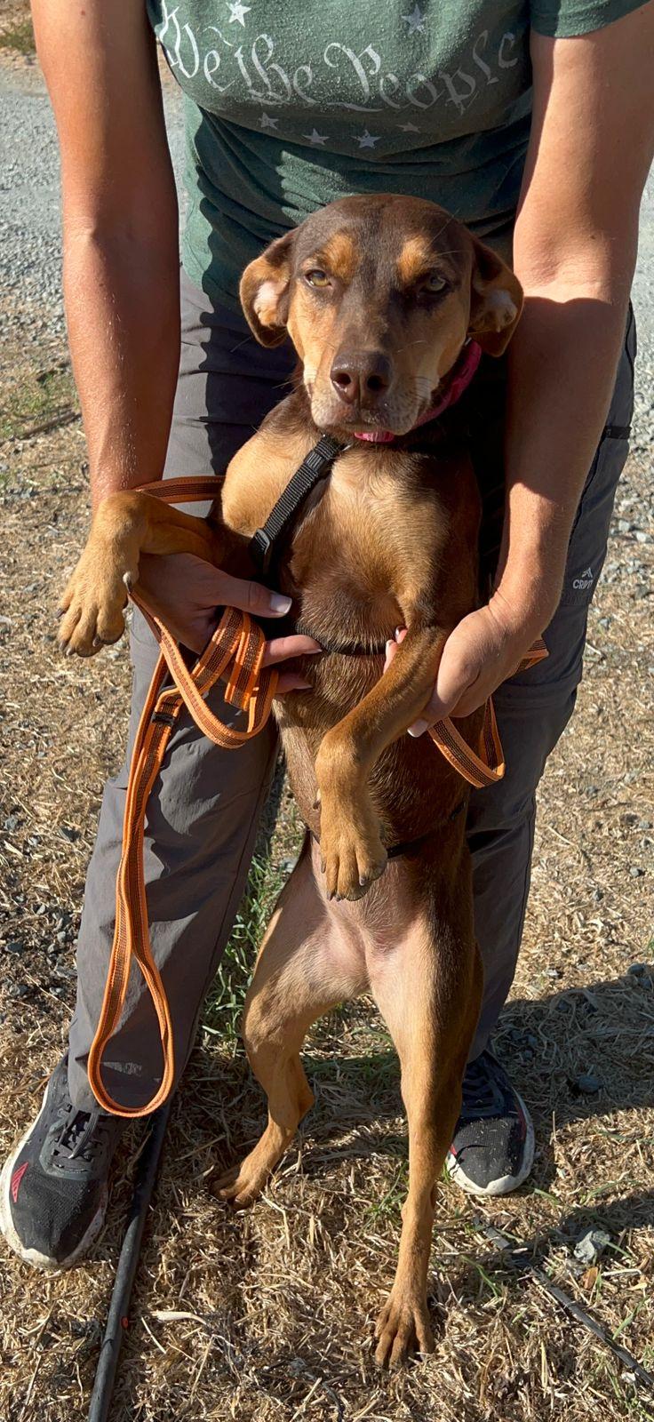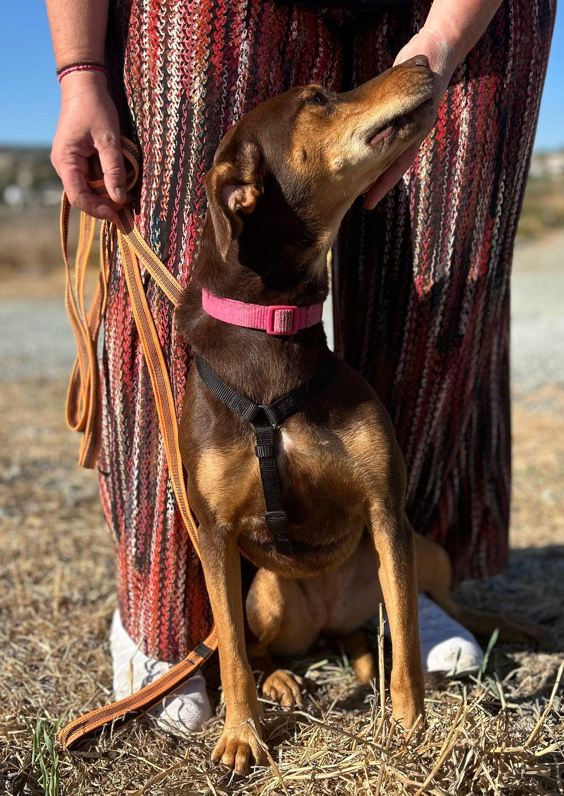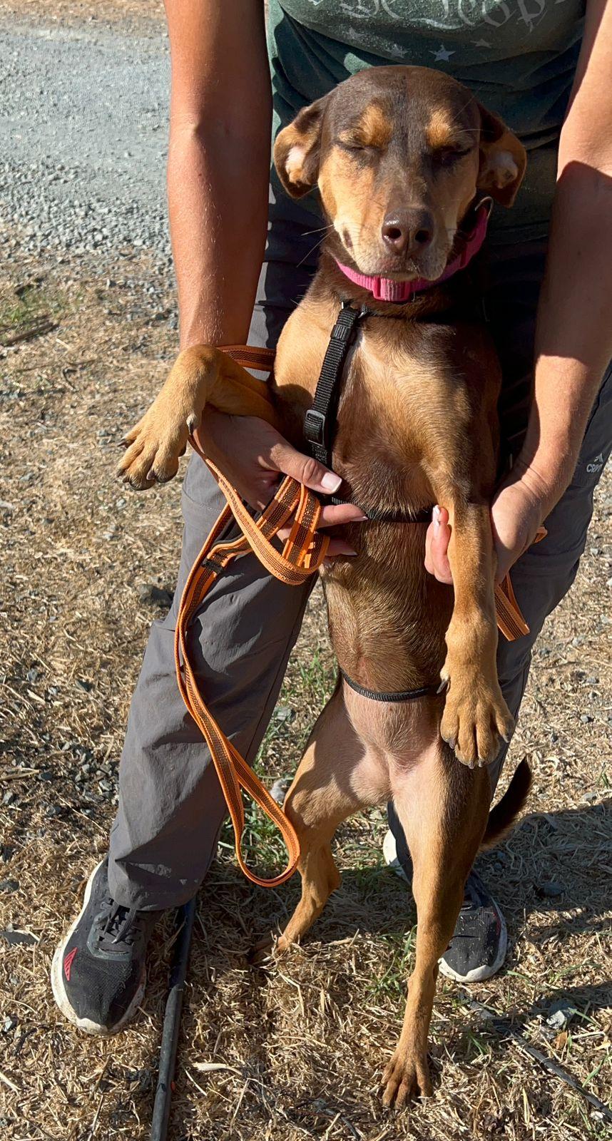 Toffee werd gevonden langs de weg met haar pups. Haar precieze ras is onbekend, maar haar stevige bouw, vrolijke staart en alerte oren verraden dat er waarschijnlijk wat jachthond in haar bloed zit.