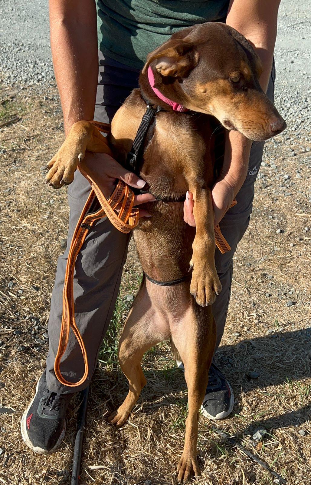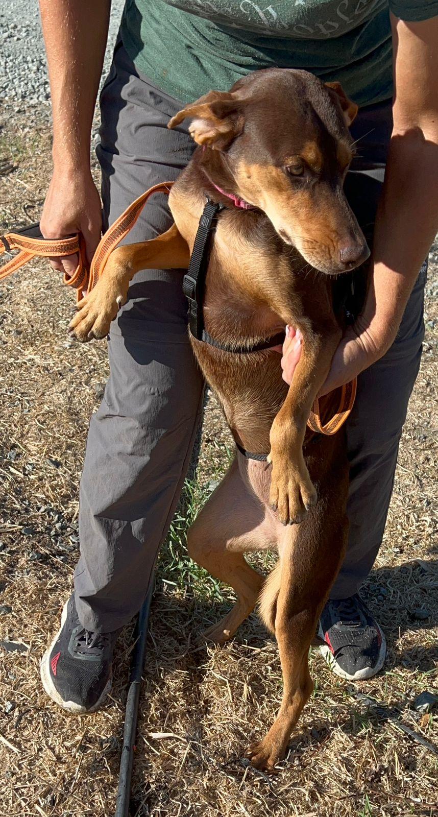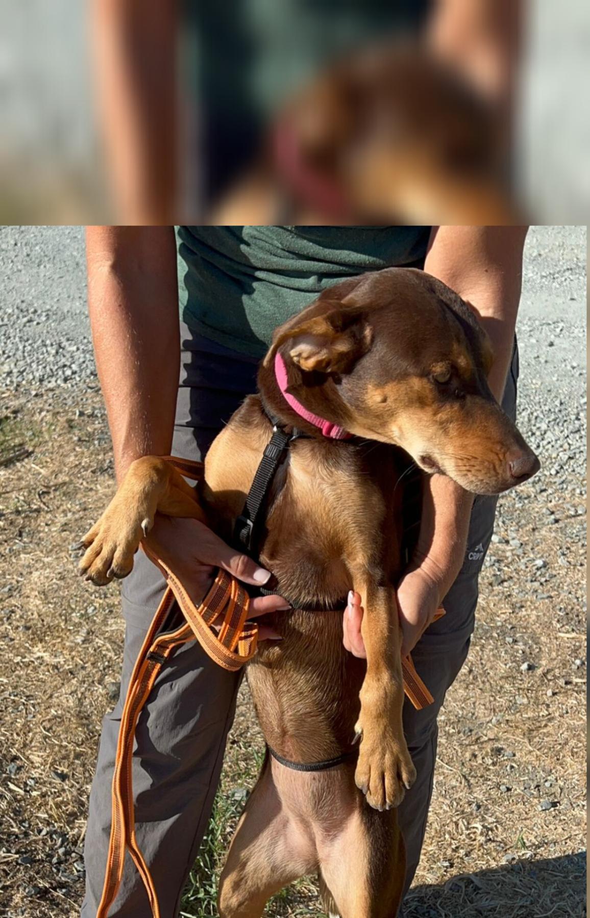 Toffee werd gevonden langs de weg met haar pups. Haar precieze ras is onbekend, maar haar stevige bouw, vrolijke staart en alerte oren verraden dat er waarschijnlijk wat jachthond in haar bloed zit.