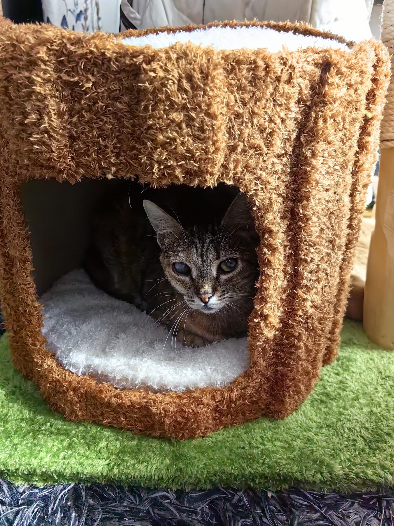 Het is een heel speciaal meisje. Ze is aardig en heel knuffelig. Zodra je haar aanraakt gaat ze spinnen en met haar pootjes kneden. Ze slaapt bij haar rescuer in bed. Ze omarmd haar arm en slaapt met haar hoofd in de palm van haar hand. Ze zorgt graag voor haar poezenvrienden. Ze knuffelt ze en maakt ze schoon. Het is een juweel van een diertje. Het is kittenseizoen en als er nieuwe kittens komen slapen die een aantal nachten in een kooi. Zodra een baby roept, gaat Luna er snel heen en ze gaat op de top van de kooi liggen om de kittens gerust te stellen. Ze verzorgt ze allemaal, ook al is ze zelf niet helemaal in orde. Ze is een juweeltje.
