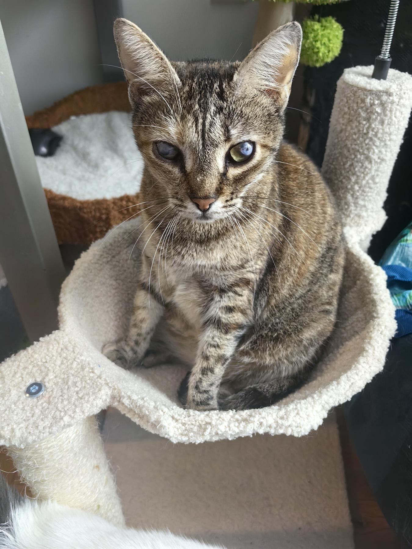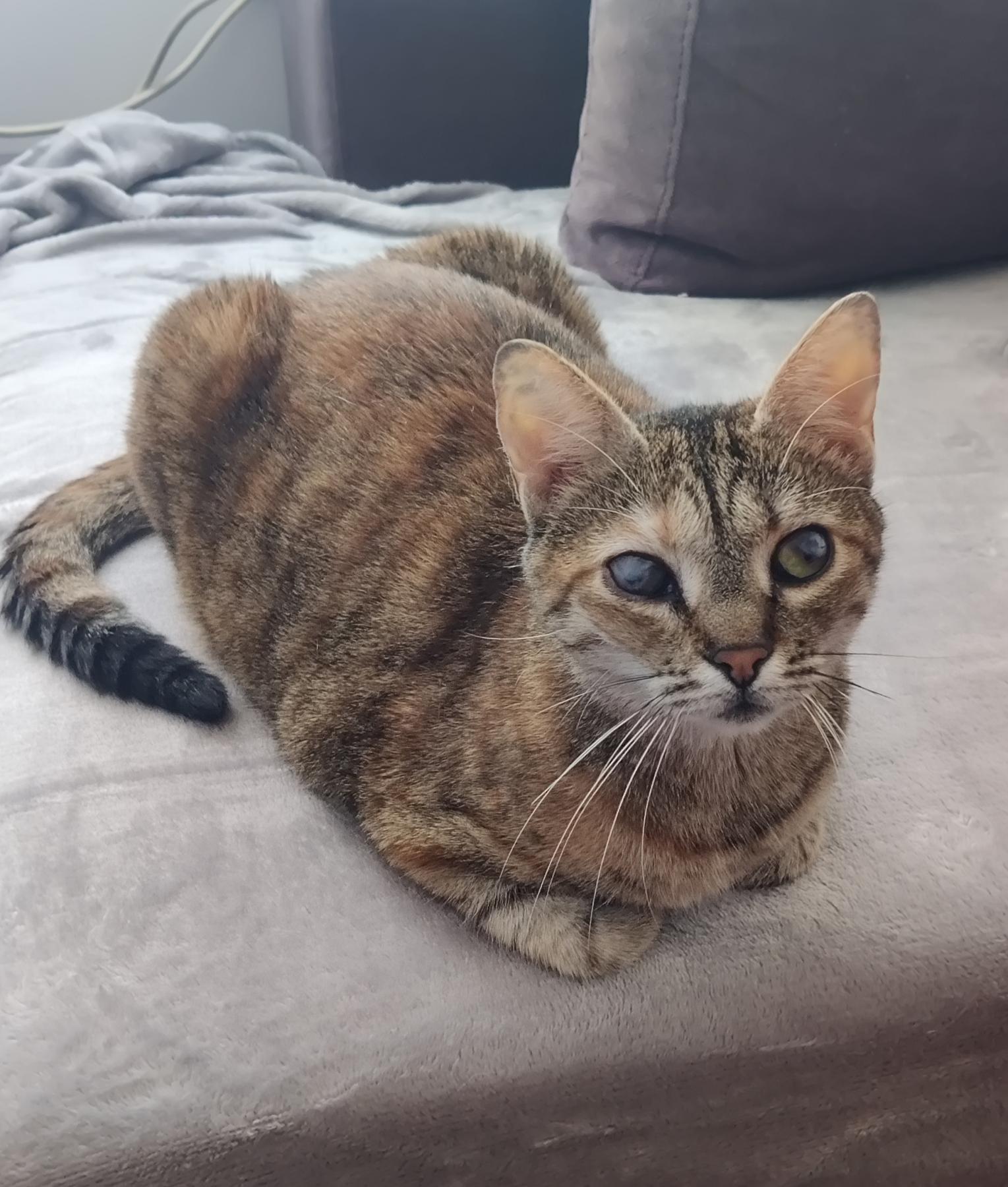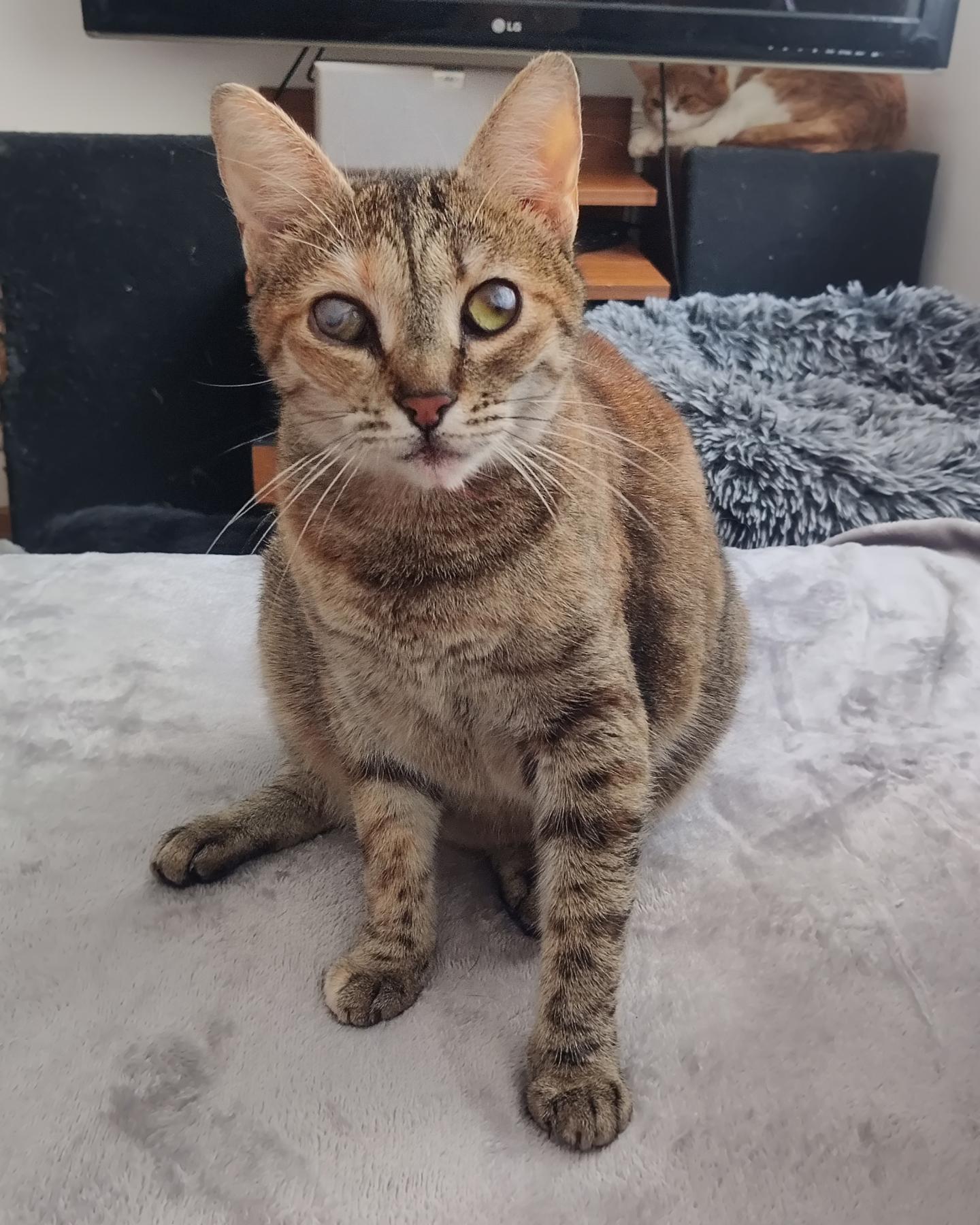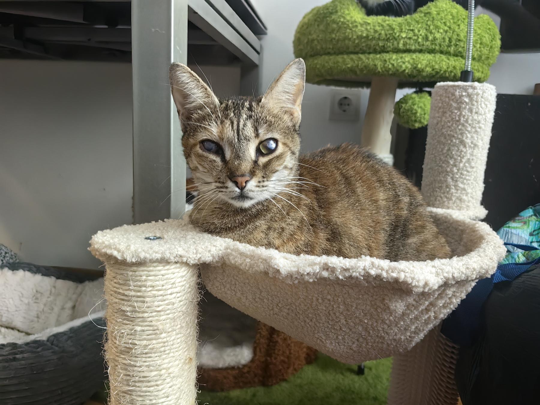 Luna is ongeveer volledig blind. Het kan niet meer verholpen worden met een operatie. Ze zal blind blijven en kan in het begin tegen dingen aanlopen. Ze heeft ook iets dat een beetje op ataxie lijkt. Eerst dachten de dierenartsen dat het door de blindheid kwam, maar dat is het niet. Ze viel uit een krabpaal van ongeveer 80cm hoog Als ze valt valt ze op haar rug of zij. Ze maakt ook geen haast met opstaan. Ze gaat met haar poten in de lucht spelen. Ze is als een blij maar langzaam kind. Ze heeft je daarbij ook nodig om op te letten dat ze zichzelf geen pijn doet.
