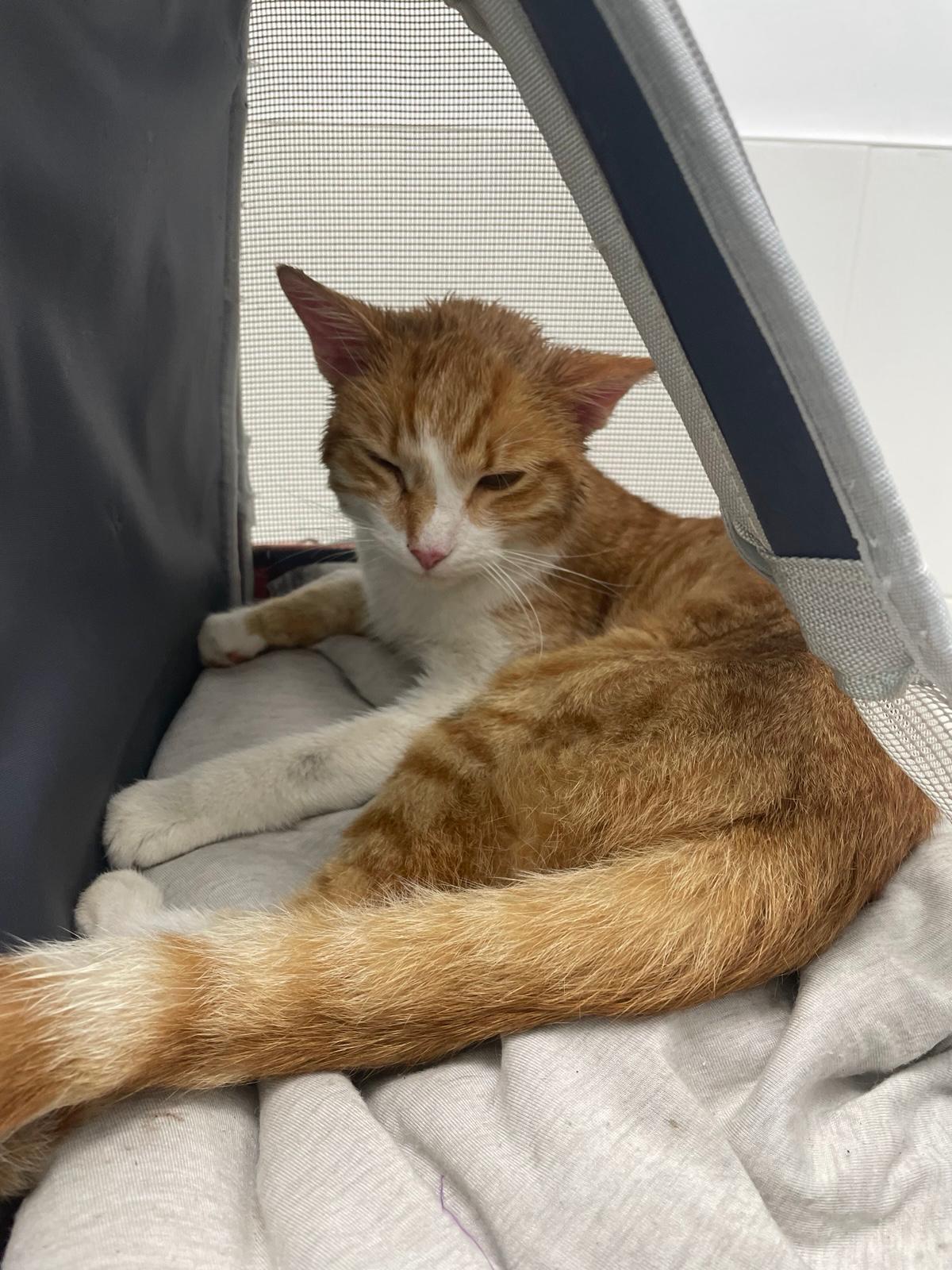 Natsu is een tedere, speelse kat. Hij werd hinkend gevonden en woog nog maar 2,3 kg. Hij liep rechtstreeks naar een van de vrijwilligers en stapte rustig in de reismand, alsof hij al wist dat hij eindelijk veilig was. Die eerste nacht wilde hij zelfs geen kip eten. Hij was gewoon blij om op een zacht bed te liggen, weg van de koude, harde straten. Nadat hij pijnstillers had gekregen, begon hij de volgende dag weer te eten. Op de röntgenfoto was te zien dat hij een gebroken heupkop had. Die is operatief verwijderd. Hoewel hij daarna een beetje anders zou lopen, was de operatie essentieel voor zijn levenskwaliteit. Eerst moest Natsu echter snel aankomen, anders zou hij de operatie niet overleven.