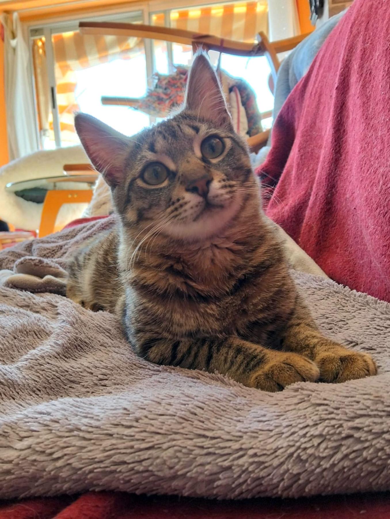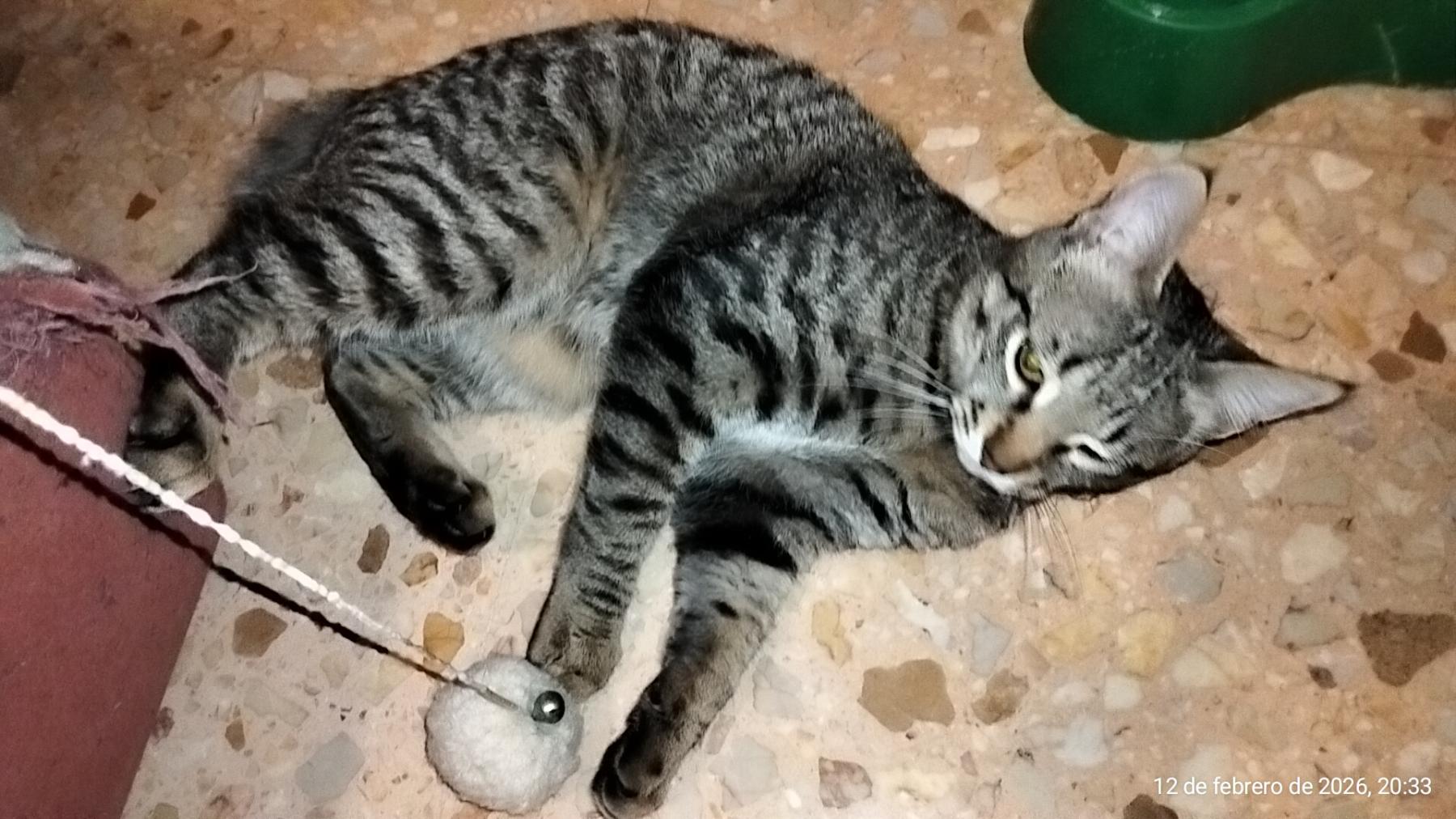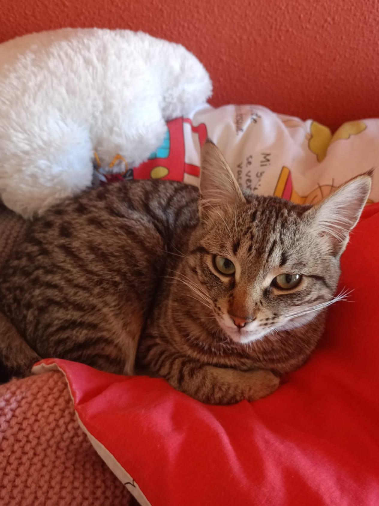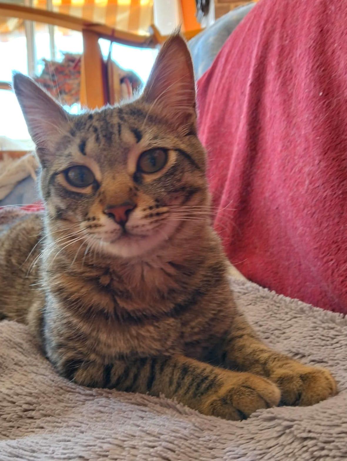 Nu, als je naar de keuken gaat, weet hij dat er snoepjes zijn, dus vraagt hij erom met super schattige miauwtjes. Hij is heel aanhankelijk, net als zijn (aangenomen) zusje Pistachita, hoewel hij ook momenten heeft waarop hij gewoon rustig wil liggen en slapen zonder dat iemand hem stoort. Hij is ook heel speels en rent en speelt graag met Pistachita, met wie hij is opgegroeid sinds we hem vonden. Hij heeft een super schattig kort staartje en een super zachte, pluizige vacht. Het is heel grappig om te zien hoe hij van rennen en springen in twee minuten in slaap valt. Zodra je hem aait of iets tegen hem zegt, begint hij als een gek te spinnen en sluit hij zijn ogen van genot. Hij kan het heel goed vinden met de andere volwassen katten in huis, maar vooral met Pistachita, zijn 'zusje', van wie hij onafscheidelijk is.