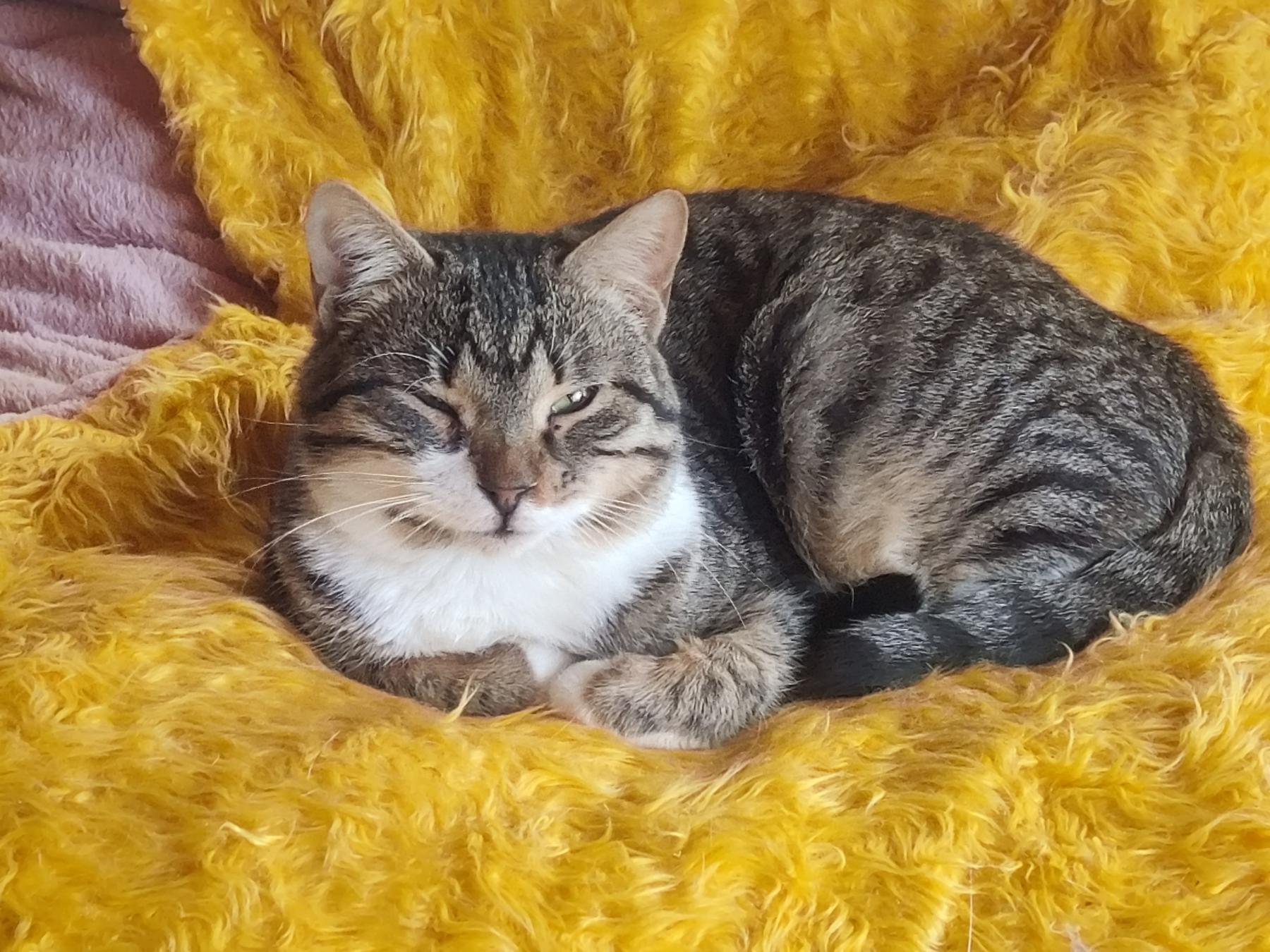 Slomo is ziek gevonden en heeft daar een wazig oog aan over gehouden. Dat oog heeft verder geen behandeling nodig. Soms is het oog een beetje nat. Shlomo is een heel lief katje. Als de verzorgster de kamer inkomt gaat hij liggen om op zijn buikje geaaid te worden. Als ze hem dan negeert volgt hij haar en zoekt hogere plaatsen op om gezien te worden. Hij doet alles wat hij kan om gezien te worden. Als je hem dan maar aait, dat is het doel. Hij is pure liefde voor mensen.