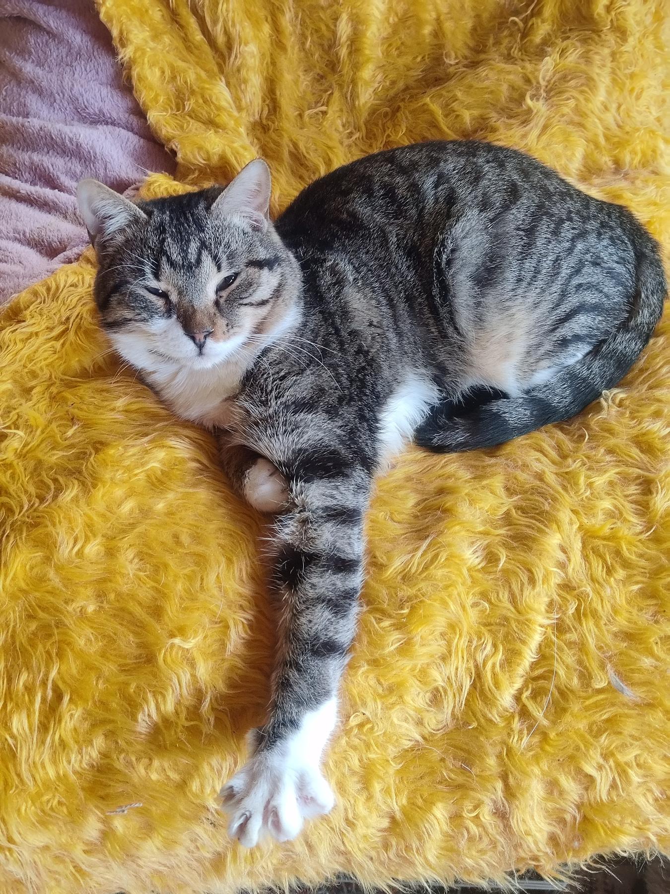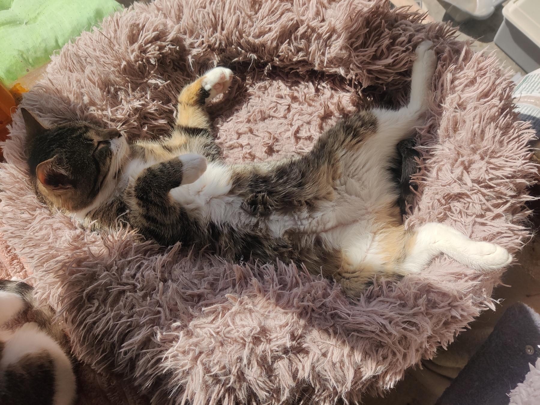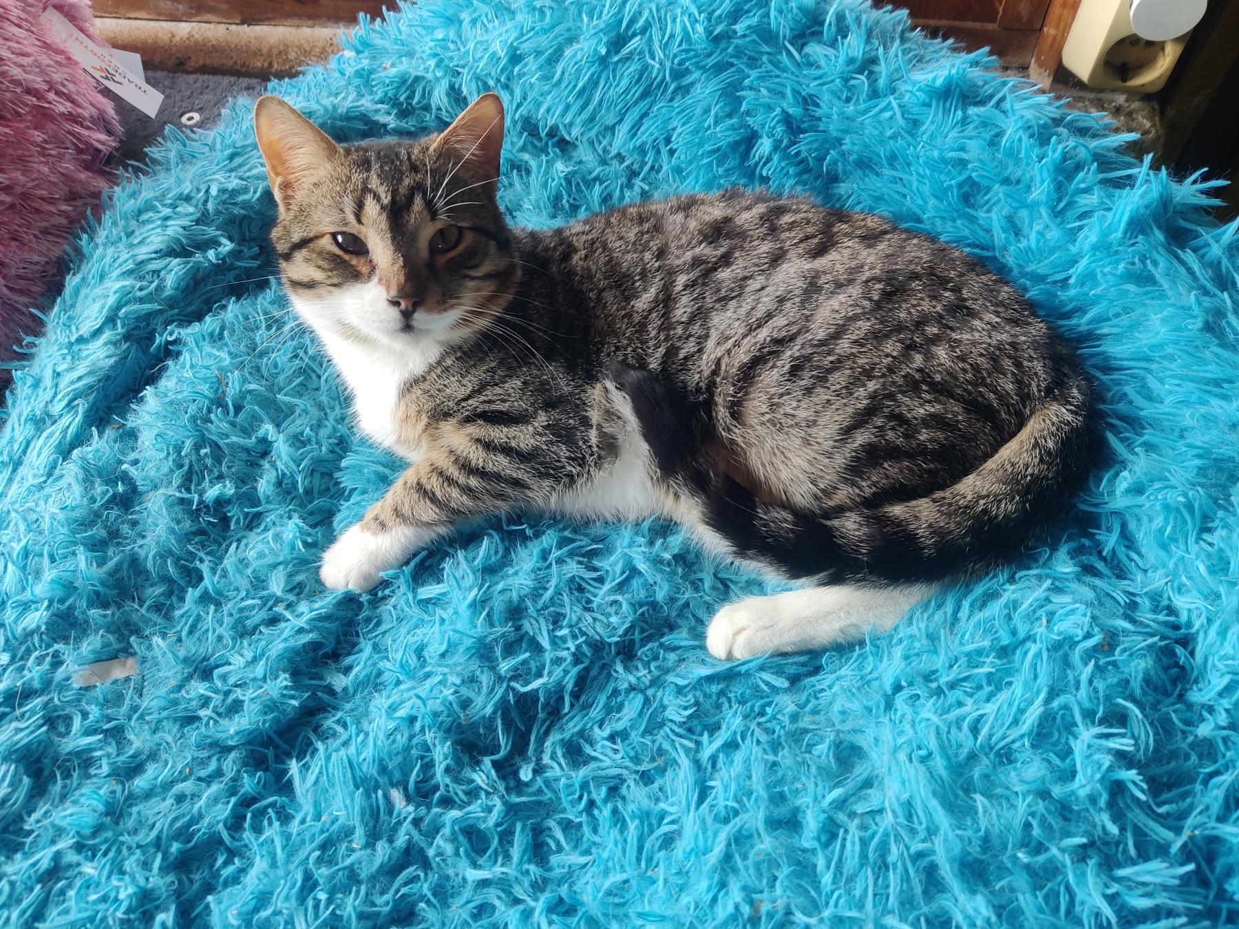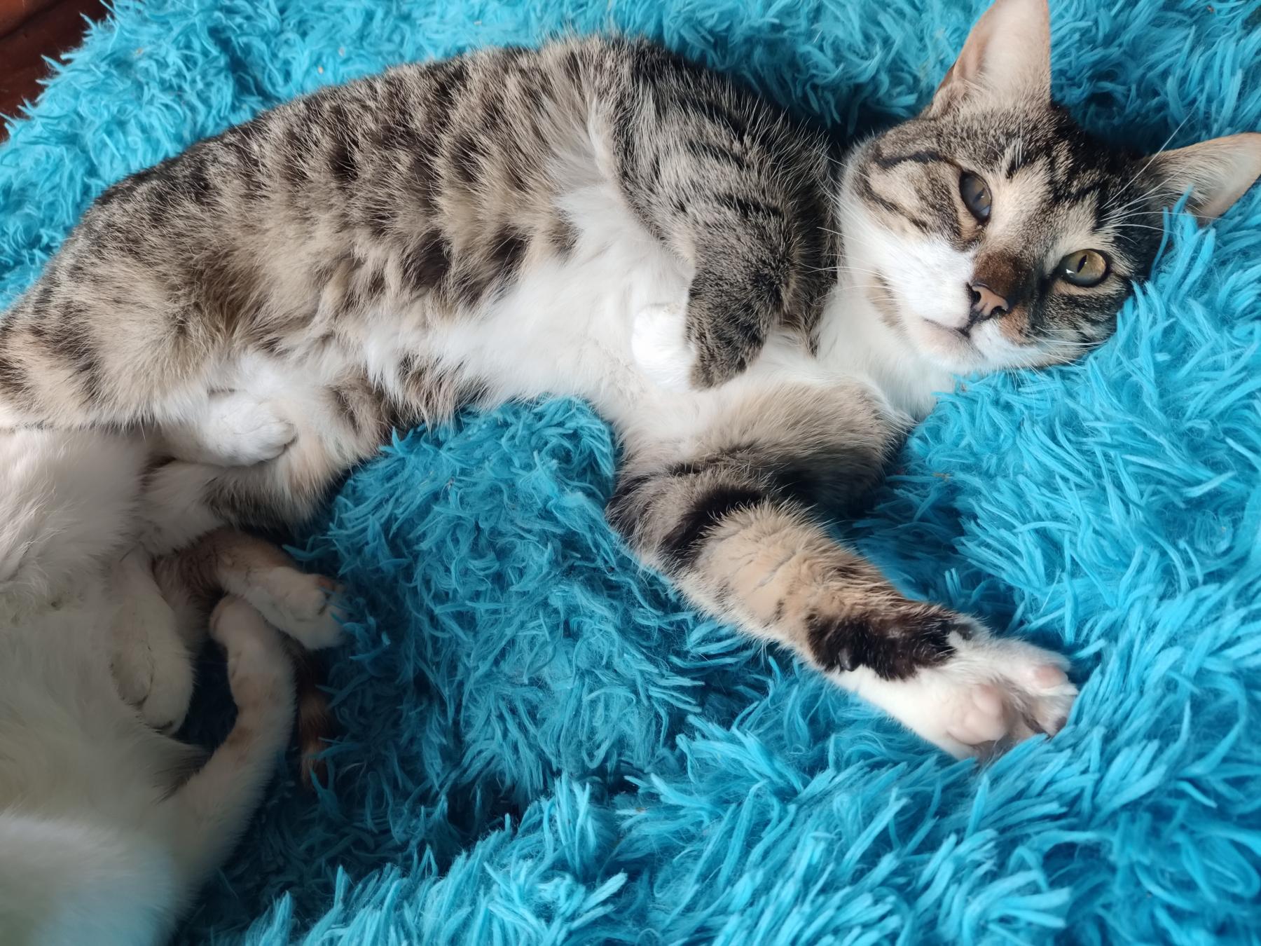 Shlomo is een heel lief katje. Als de verzorgster de kamer inkomt gaat hij liggen om op zijn buikje geaaid te worden. Hij is pure liefde voor mensen