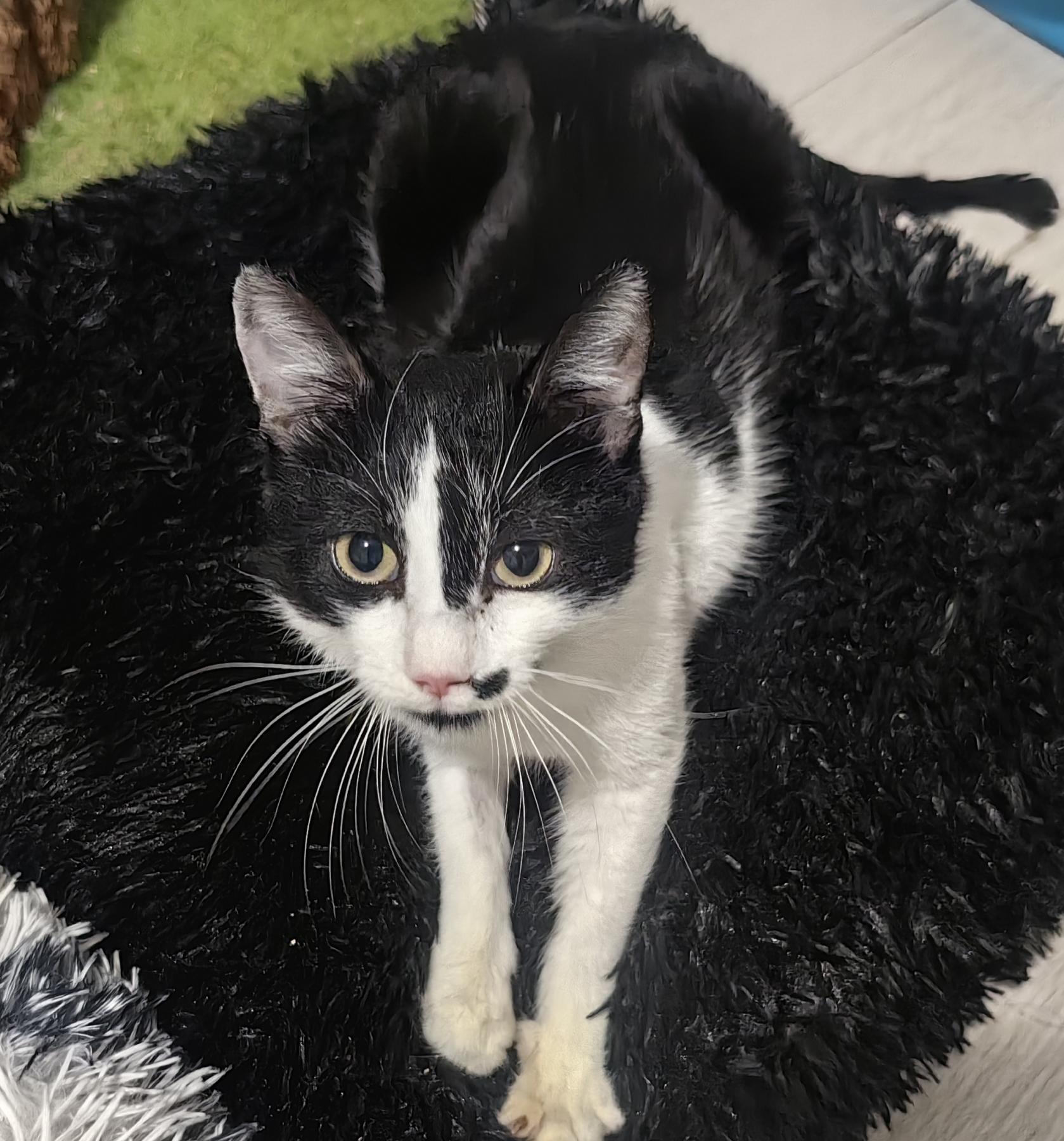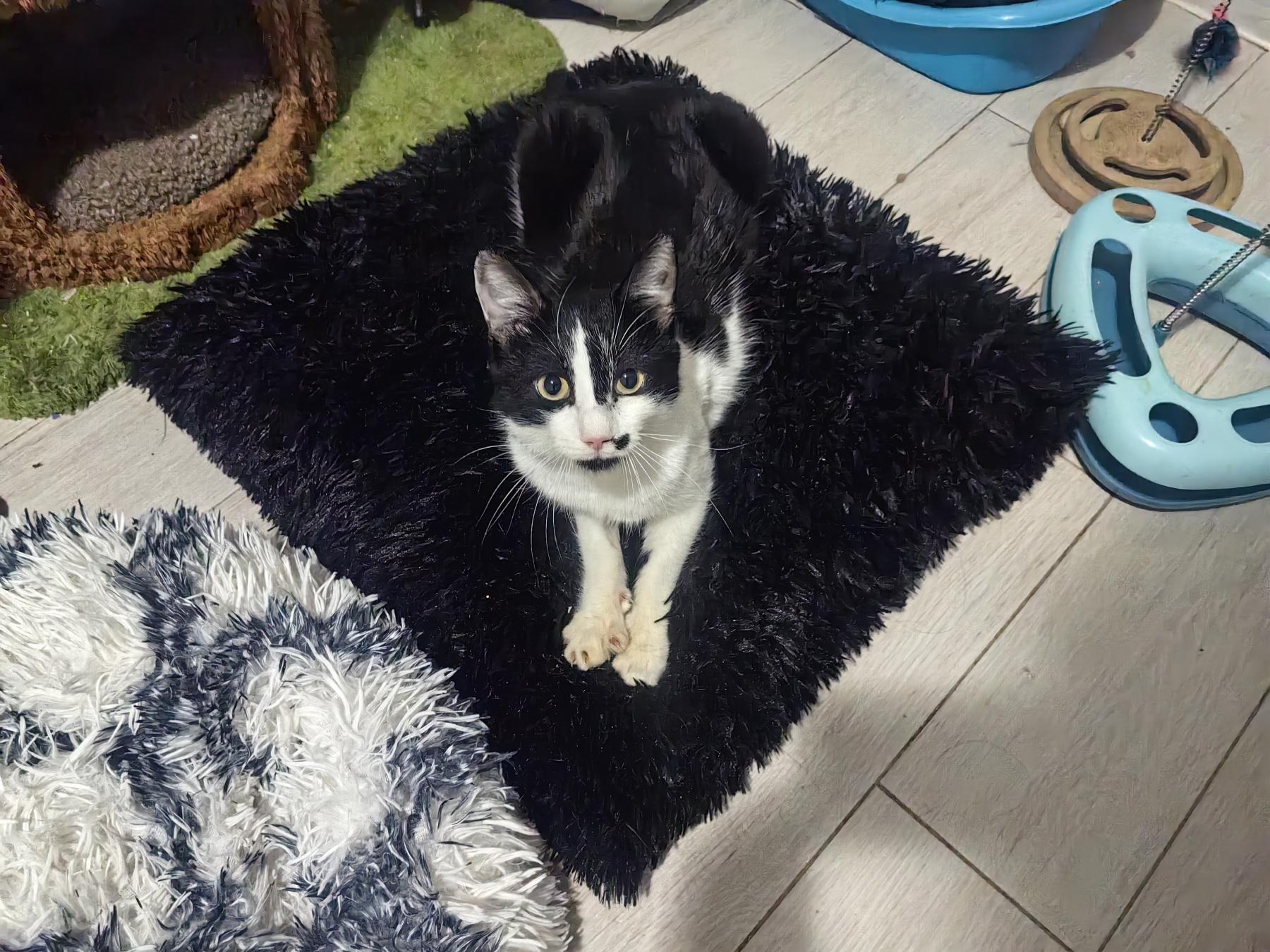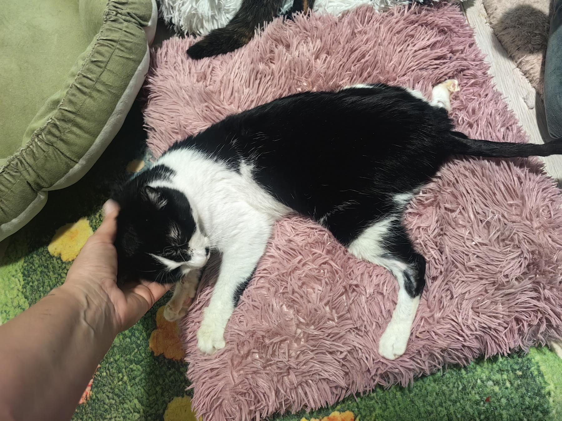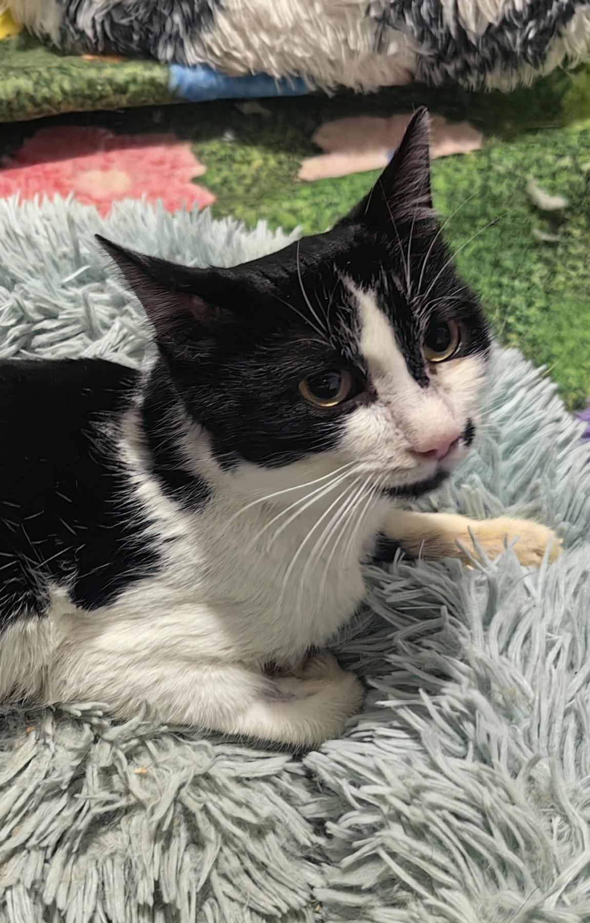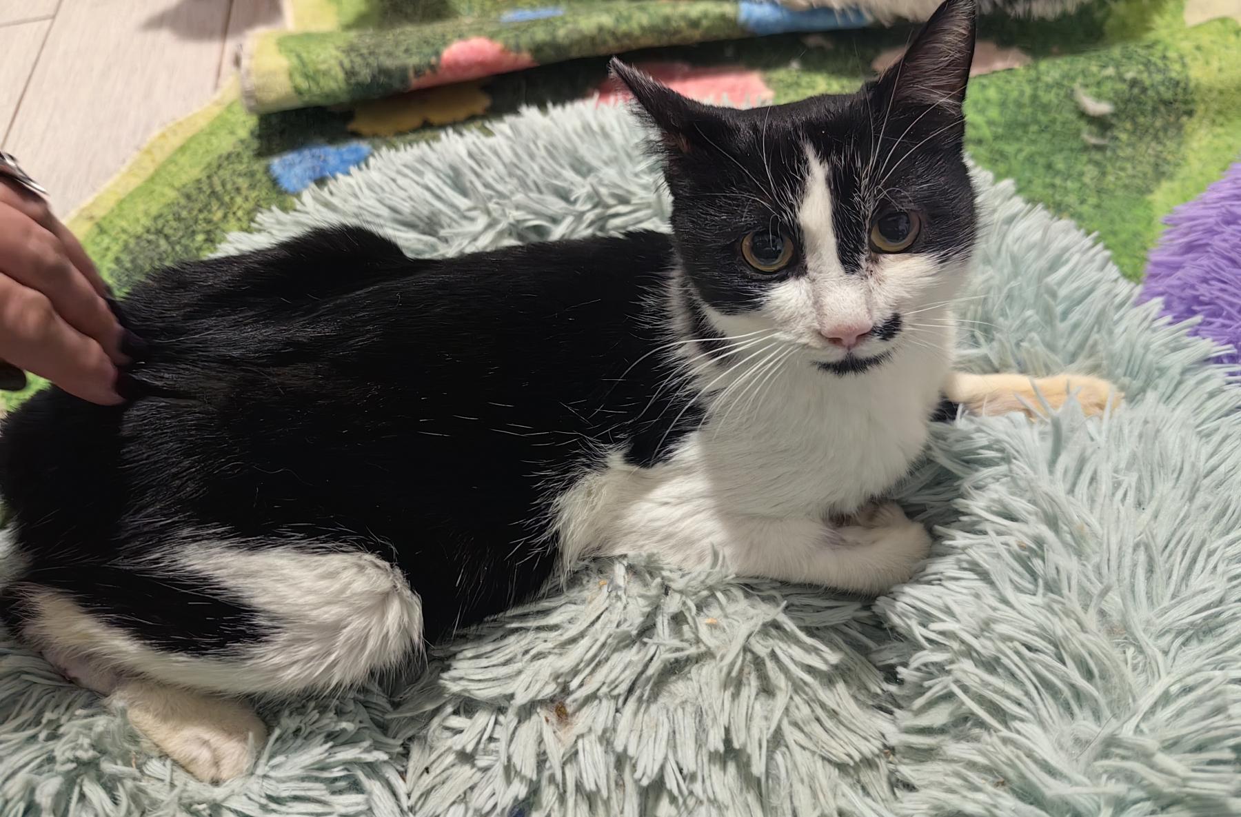 Tuxi is onder de verf gevonden, op het moment dat de fotos gemaakt zijn miste hij nog steeds haar. Hij was behoorlijk ziek, gelukkig is hij inmiddels een gezonde jongen. Hij is een ontzettend knuffelig katje! Hij is lief, aardig, sociaal en heel aanpasbaar. Hij begint zelfs te spinnen als hij de rescuer een andere kat ziet aaien. Hij is heel erg schattig. Het hele team van de kliniek was verdrietig toen de rescuer hem mee naar huis moest nemen na zijn verblijf voor behandeling en operatie . Hij is lief en zo schattig! Hij houdt van menselijke aandacht. Hij vindt het heerlijk om met andere katten te spelen en te knuffelen. Hij is een echt sociaal dier.